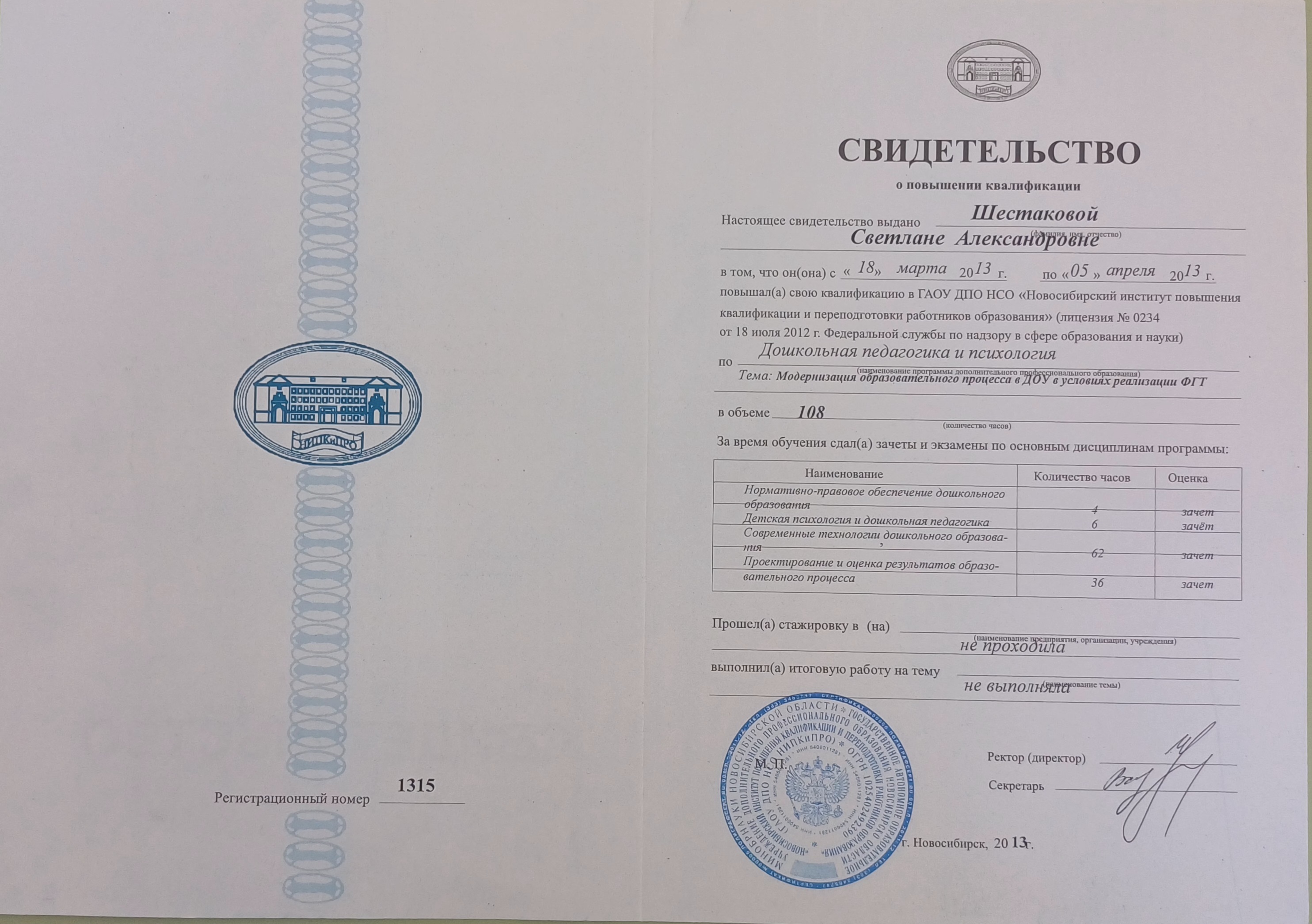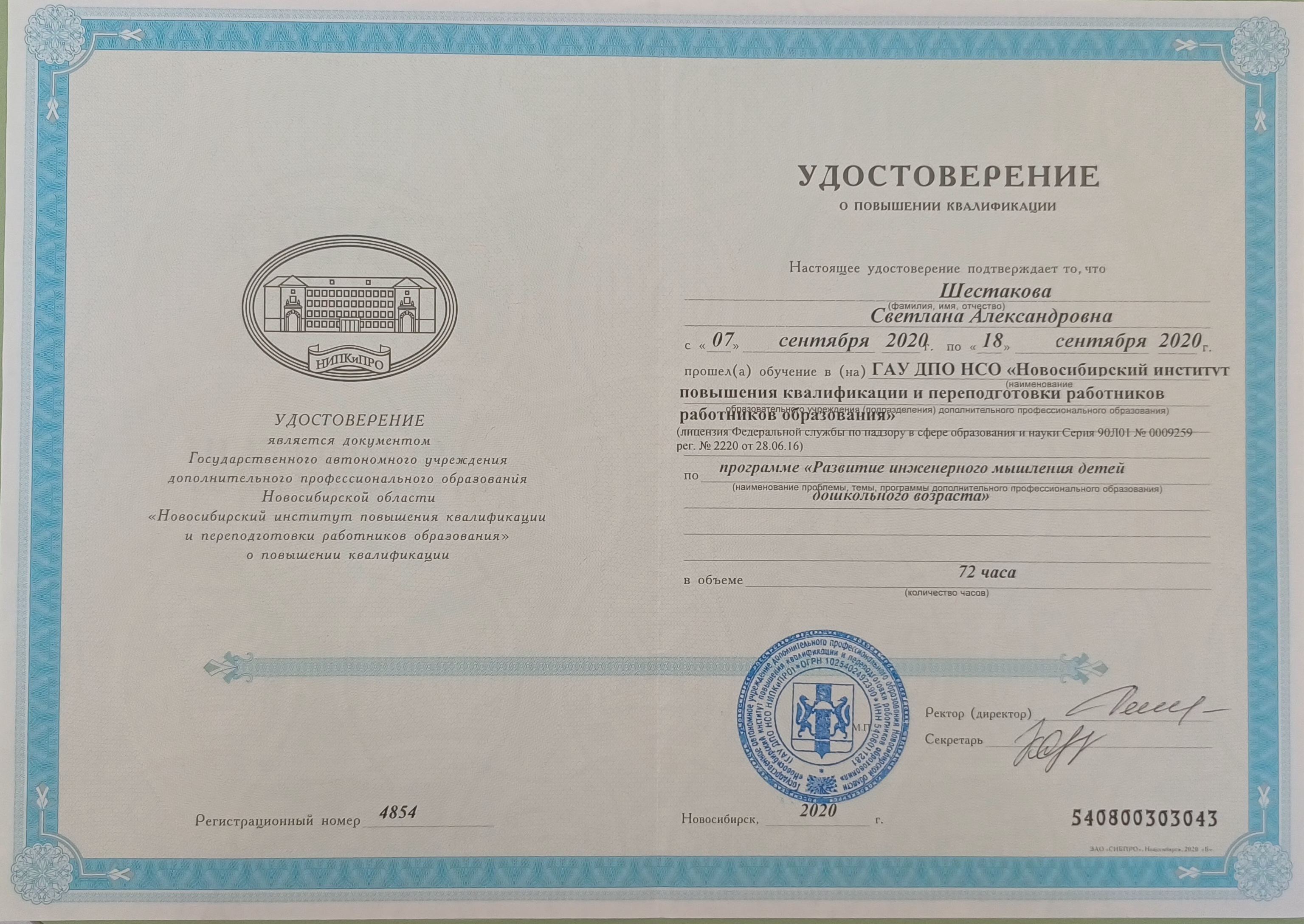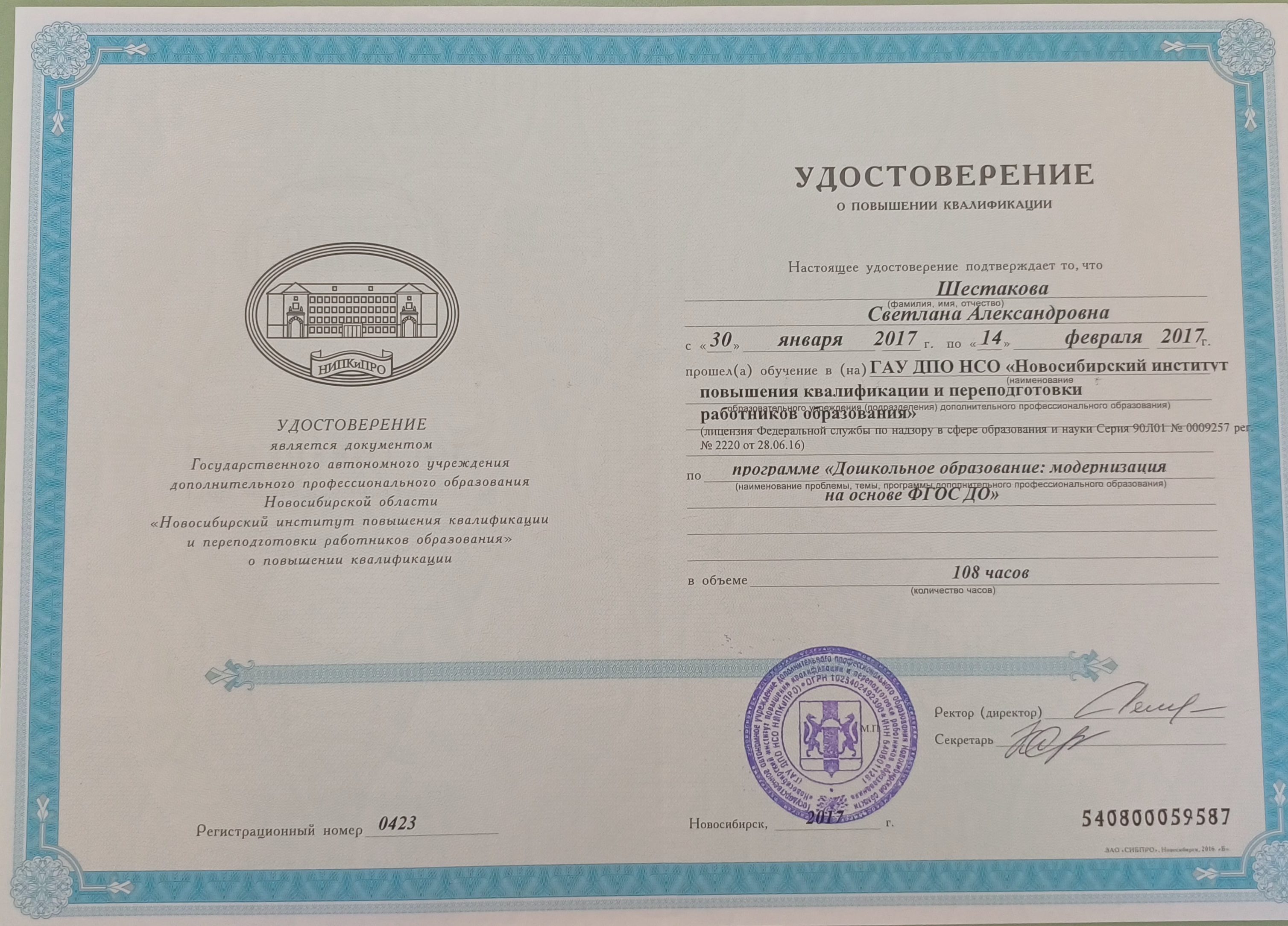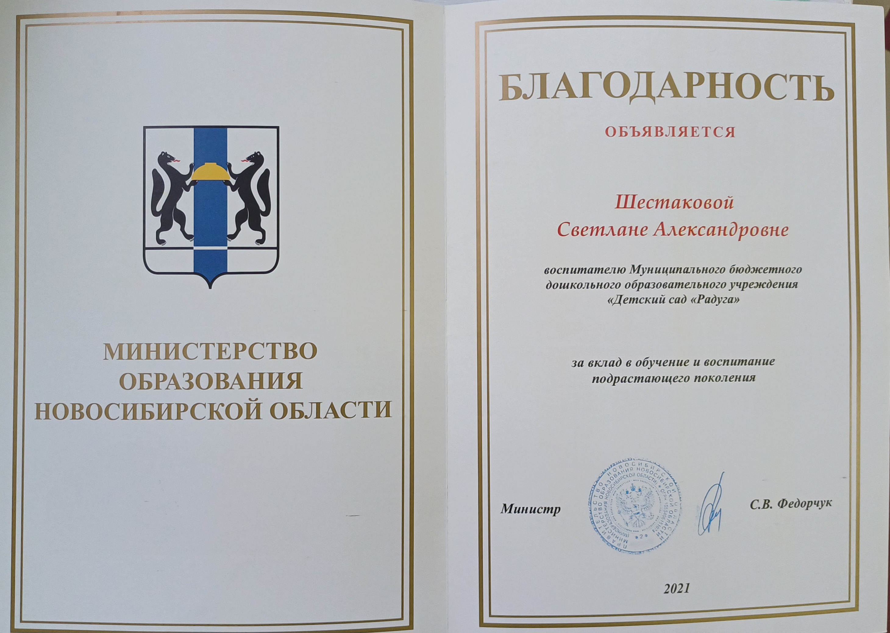Благодарность Министерства образования Новосибирской области за вклад в обучение и воспитание подрастающего поколения