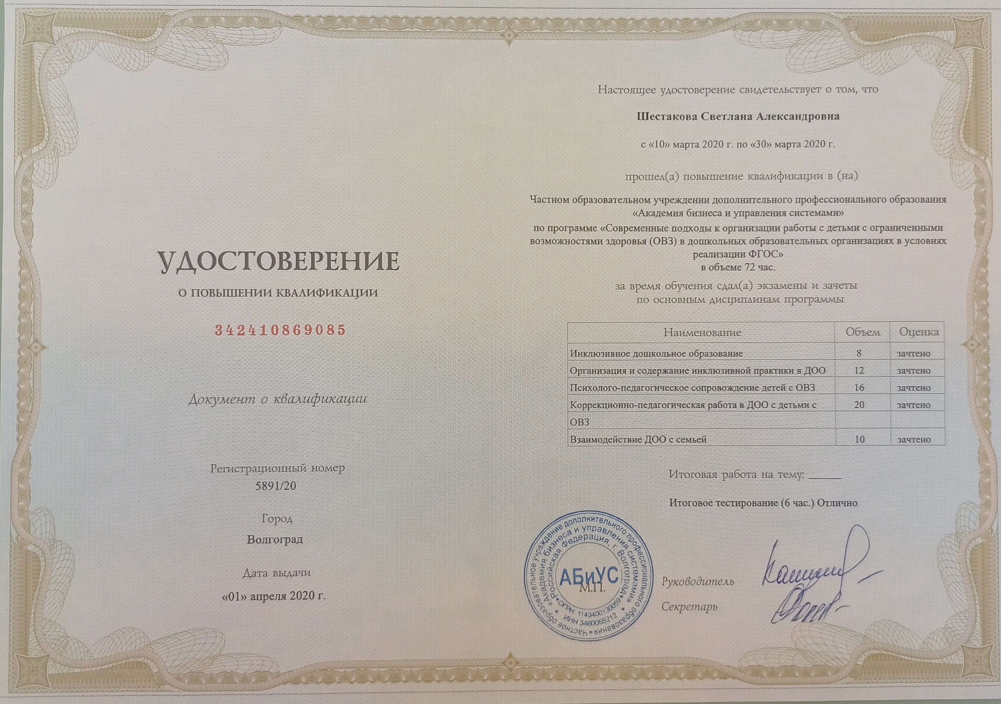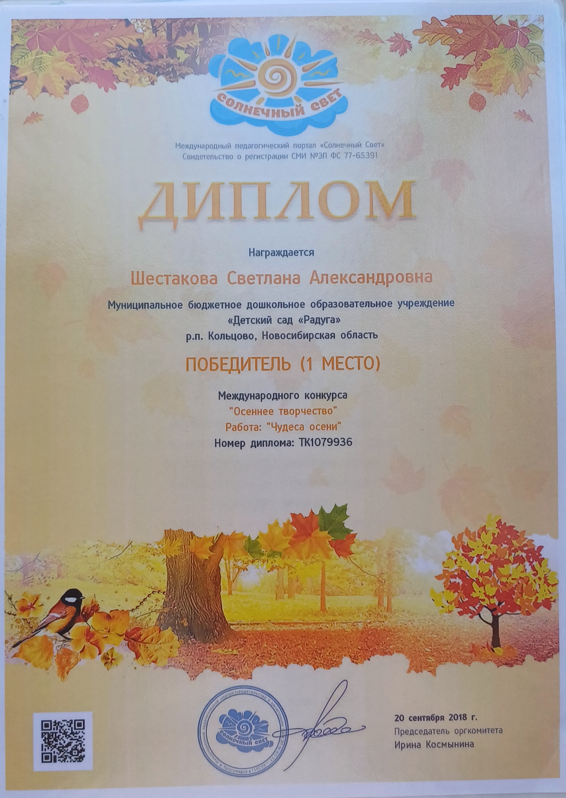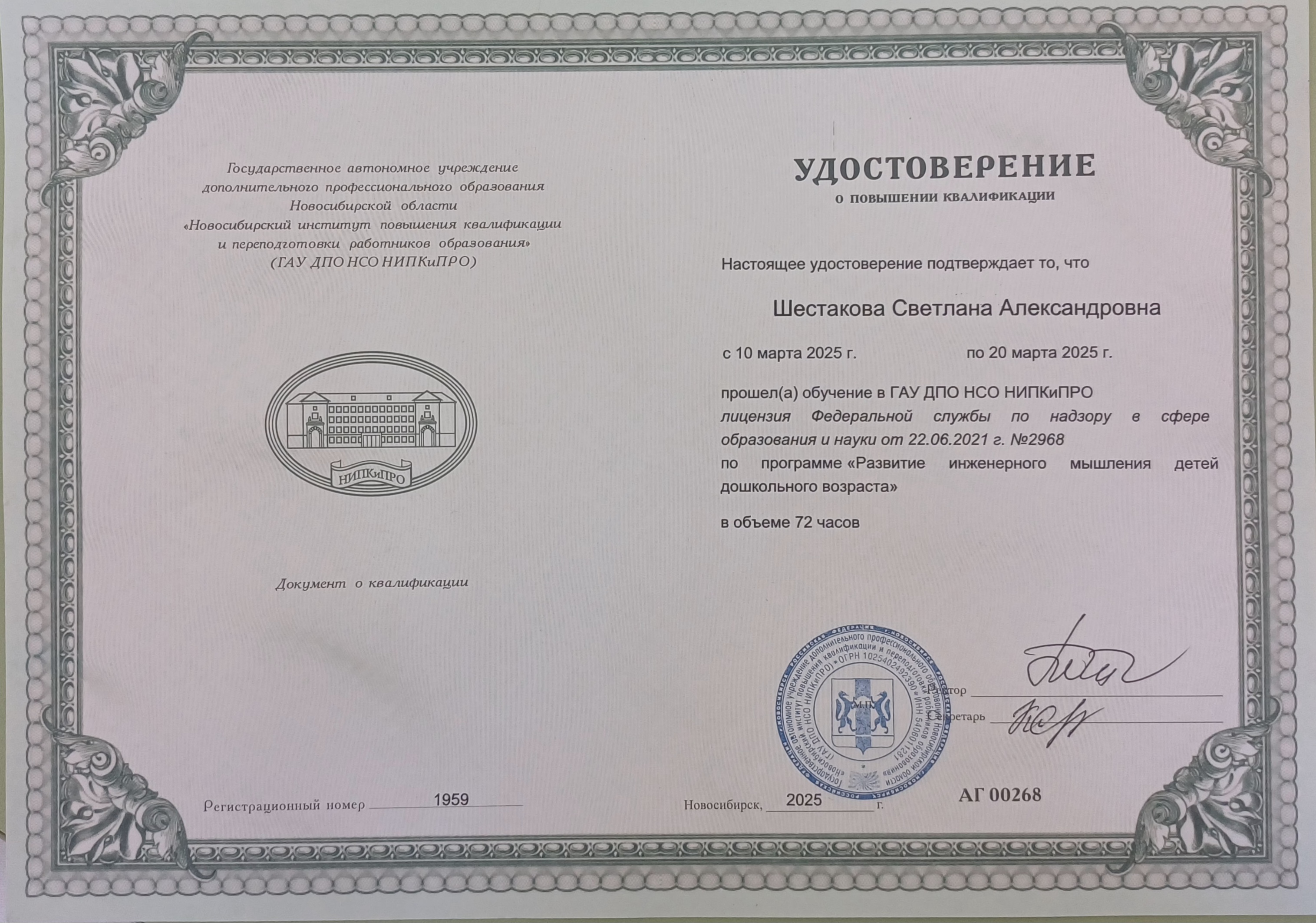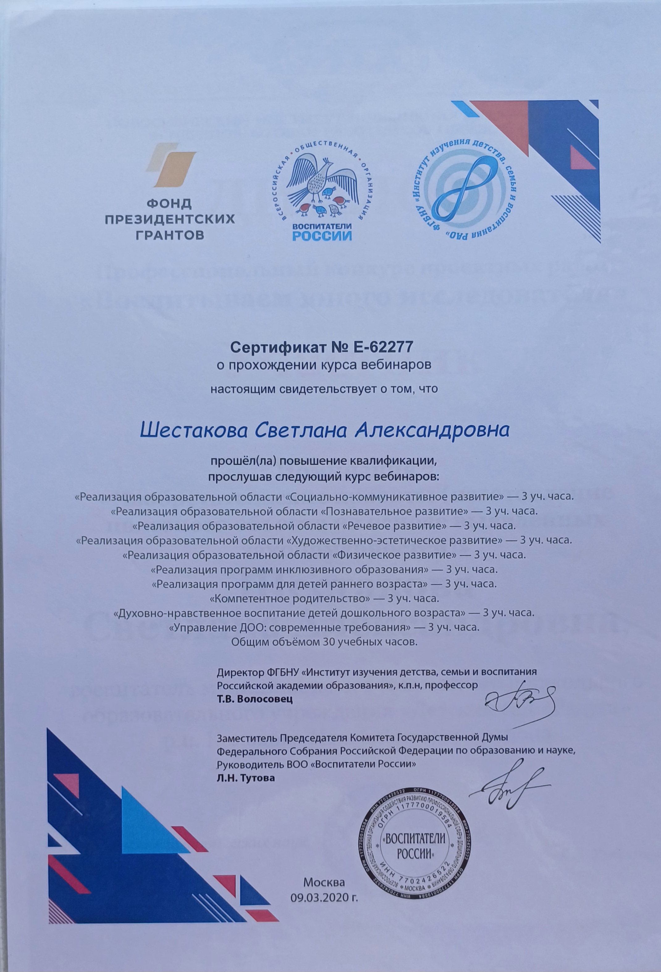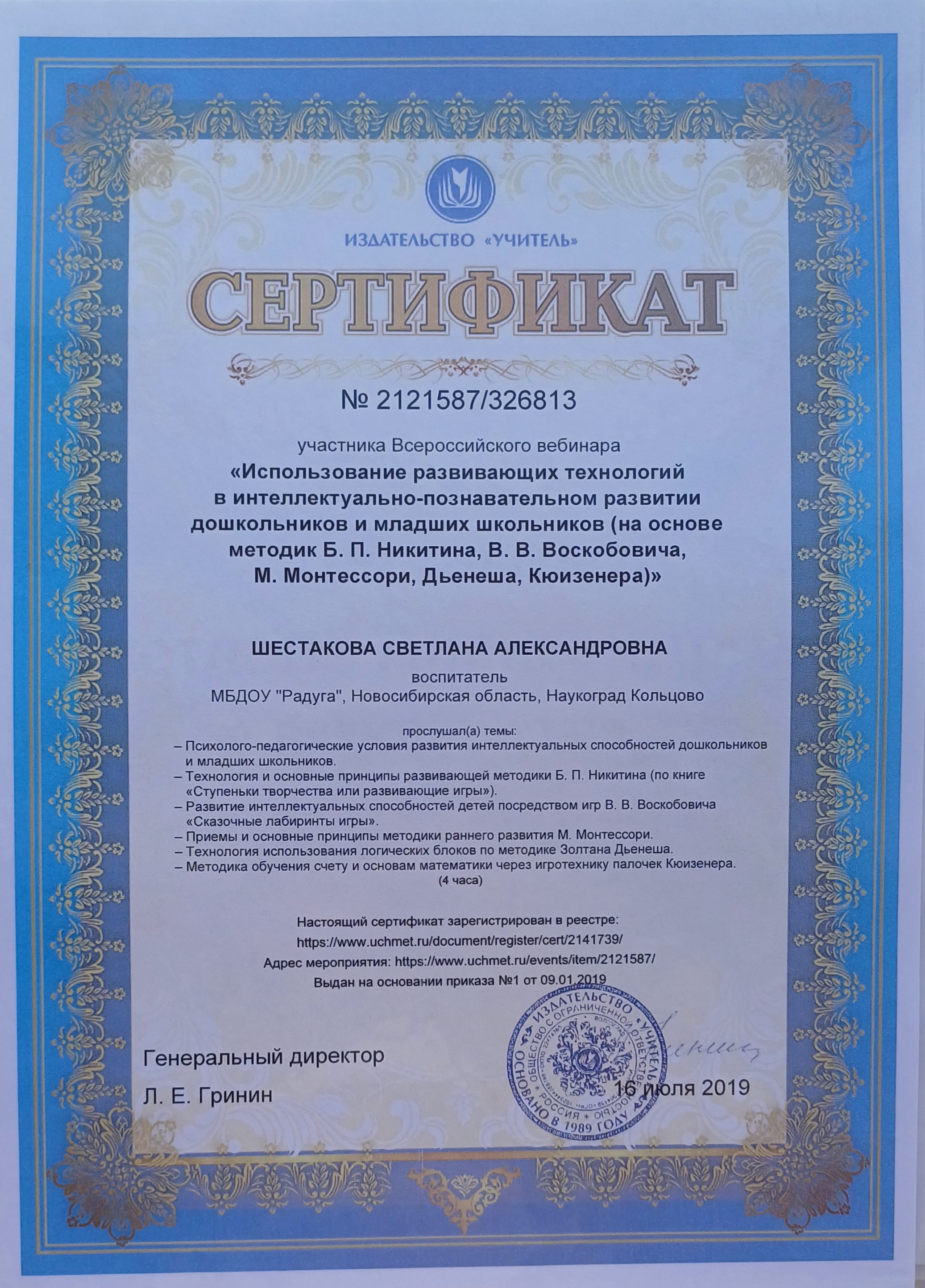 Сертификат участника Всероссийского вебинара "Использование развивающих технологий в интеллектуально- познавательно развитии дошкольников и младших школьников (на основе методик Б.П. Никитина, В.В. Воскобовича, М. Монтессори, Дьенеша, Кюизенера)