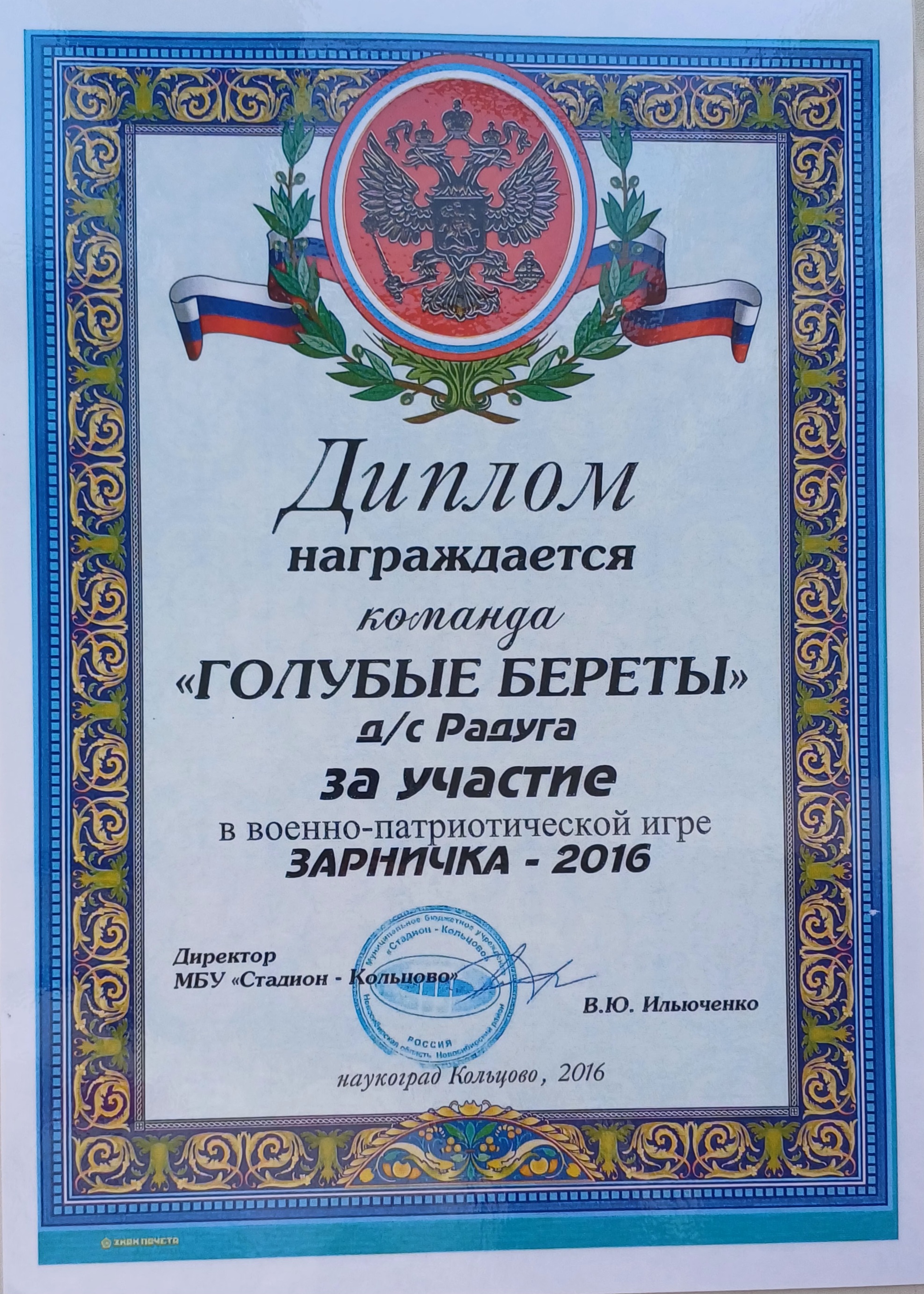 Диплом за участие в военно-потриатической игре "Зарничка"