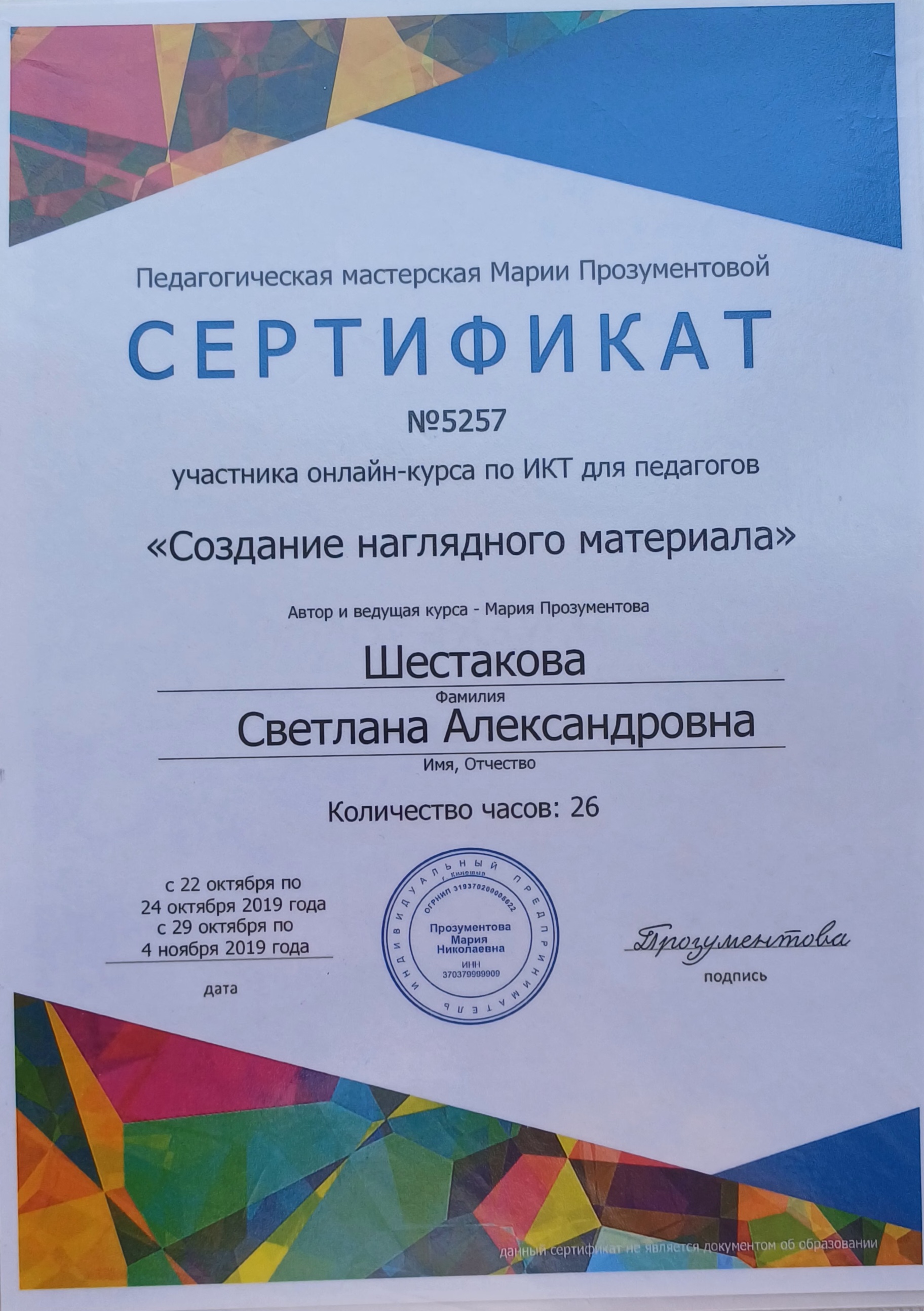 Сертификат участника онлайн-курса по ИКТ для педагогов "Создание наглядного материала"