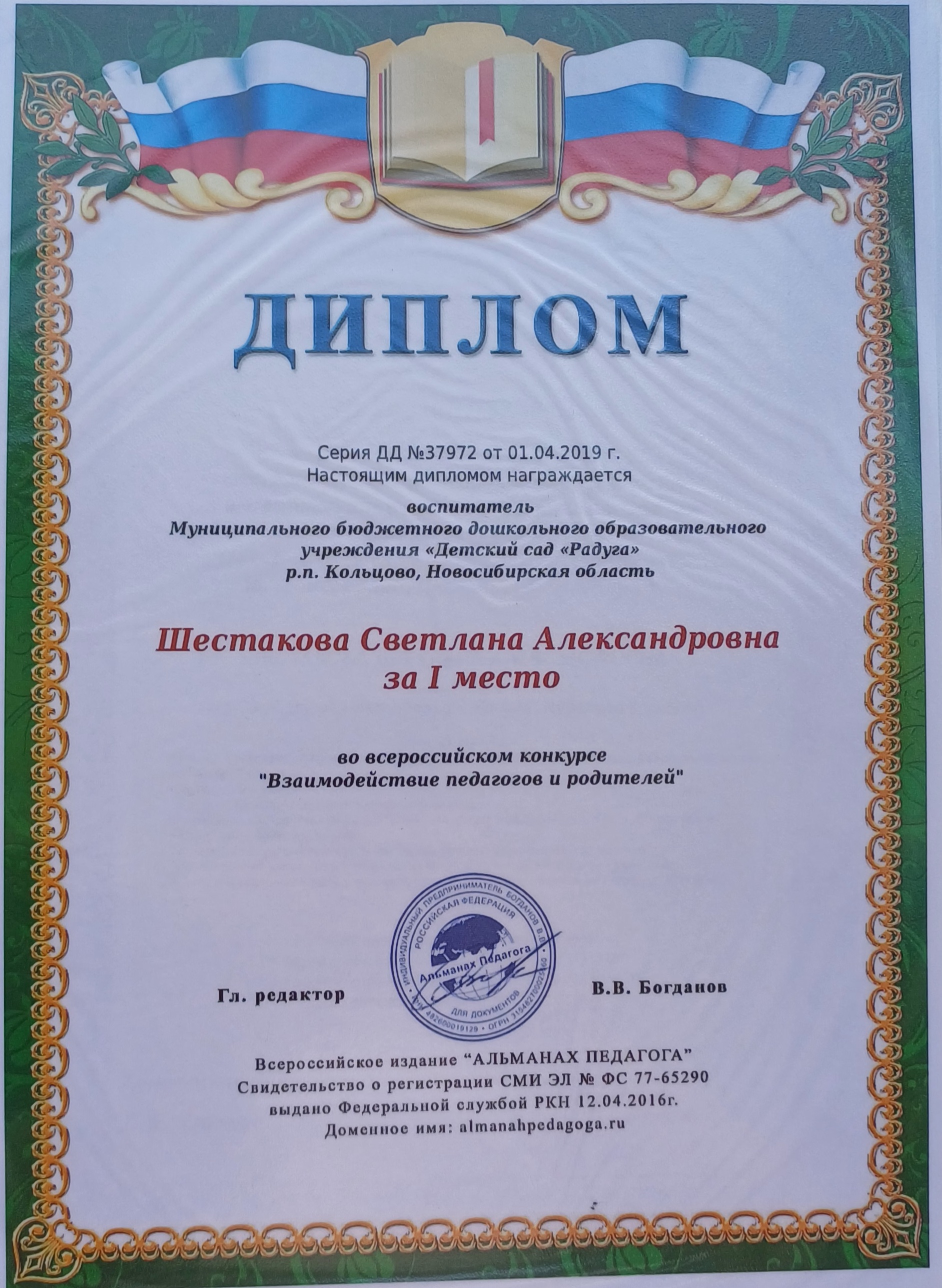 Диплом за I место во Всероссийском конкурсе "Взаимодействие педагогов и родителей"