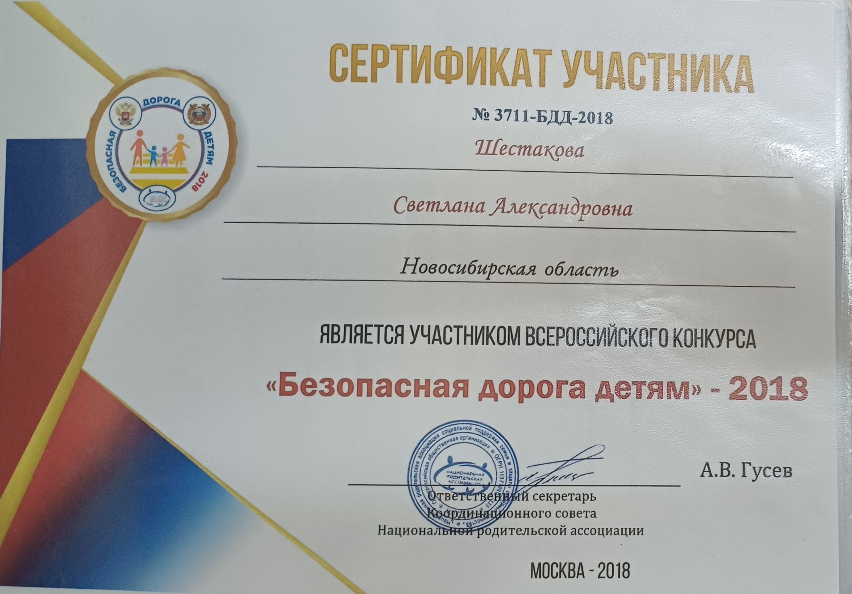 Сертификат участника Всероссийского конкурса "Безопасная дорога детям - 2018"