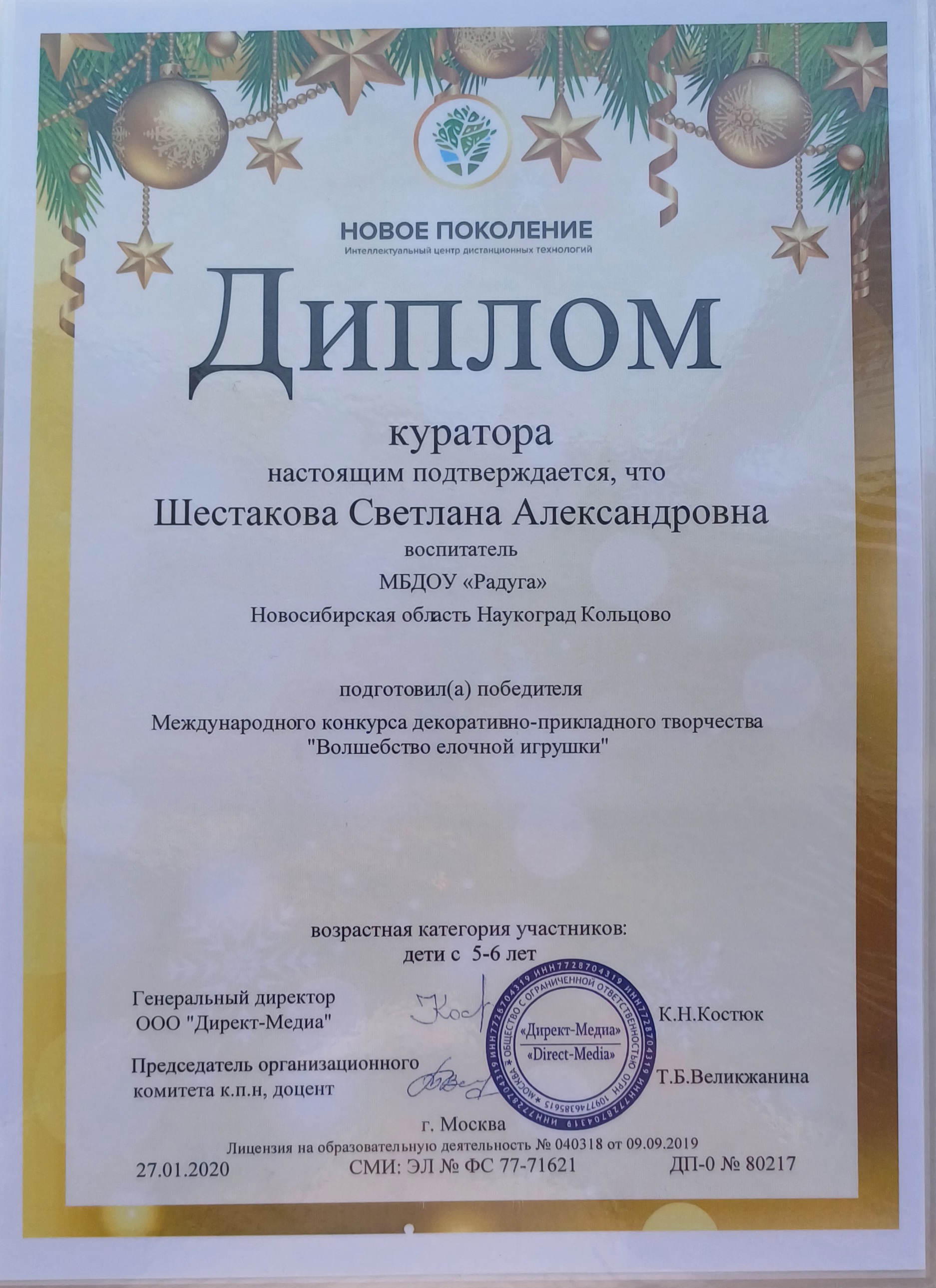Диплом куратора Международного конкурса декоративно - прикладного творчества "Волшебство елочной игрушки"