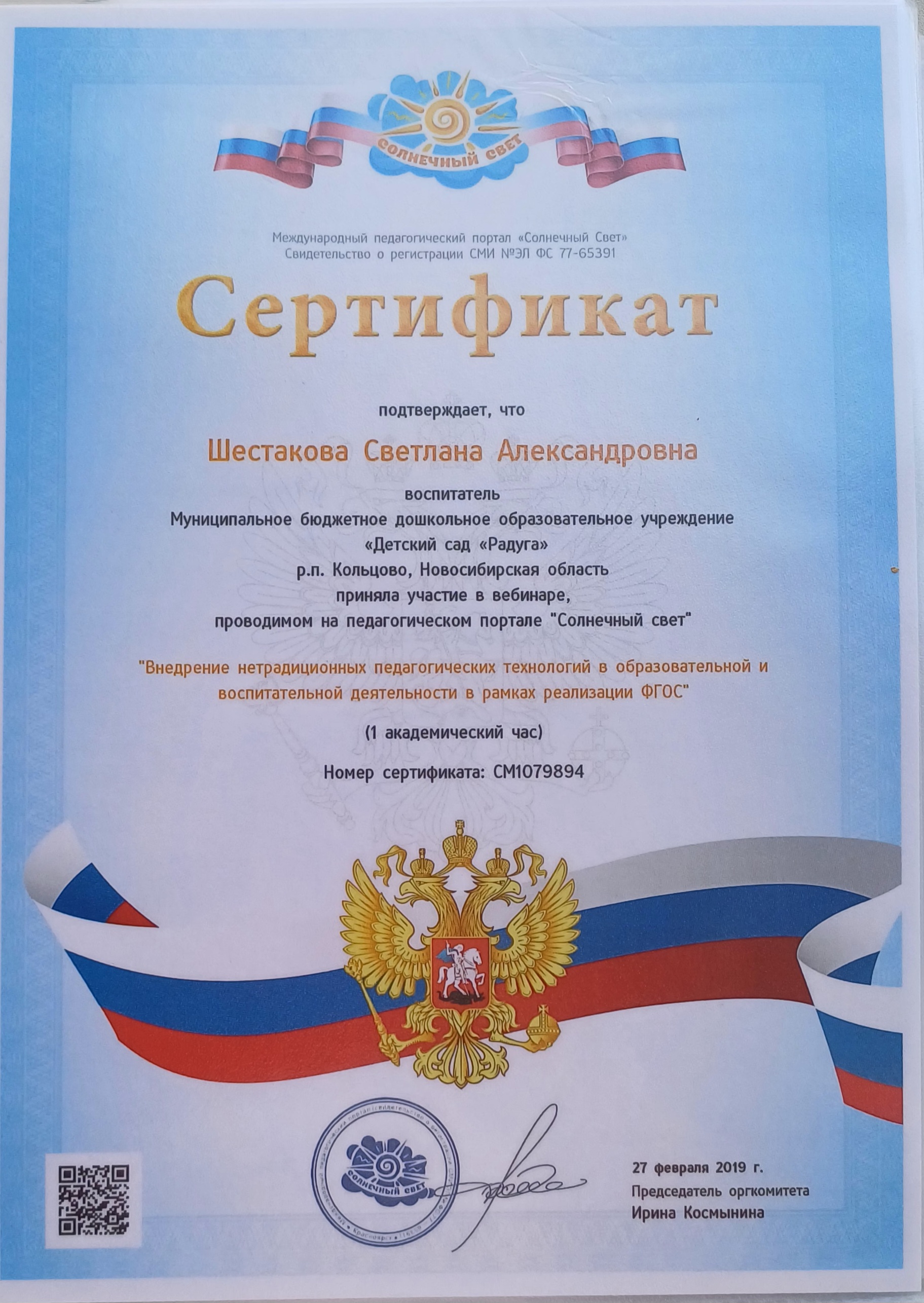 Сертификат участия в вебинаре, проводимом на педагогическом портале "Солнечный свет"