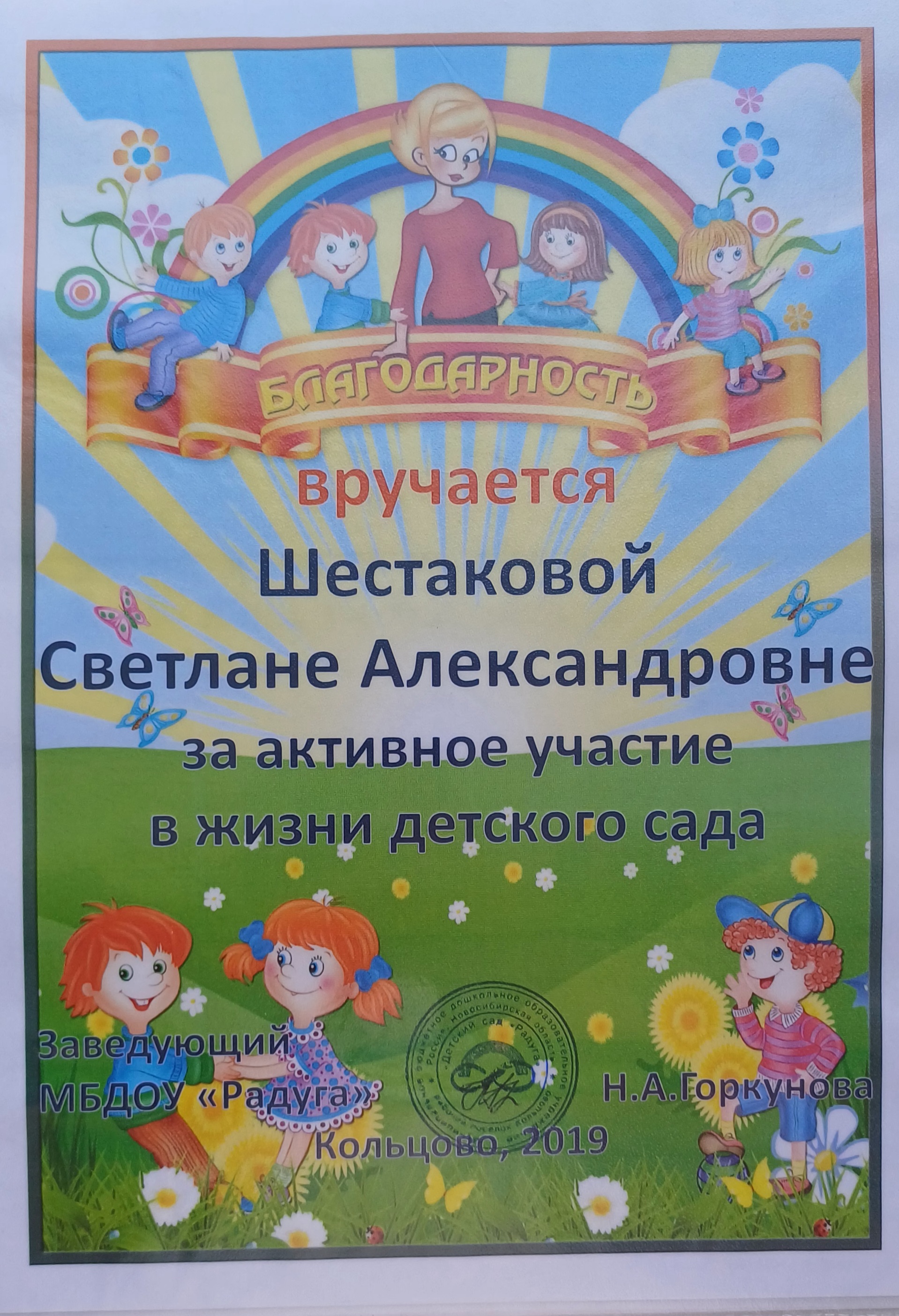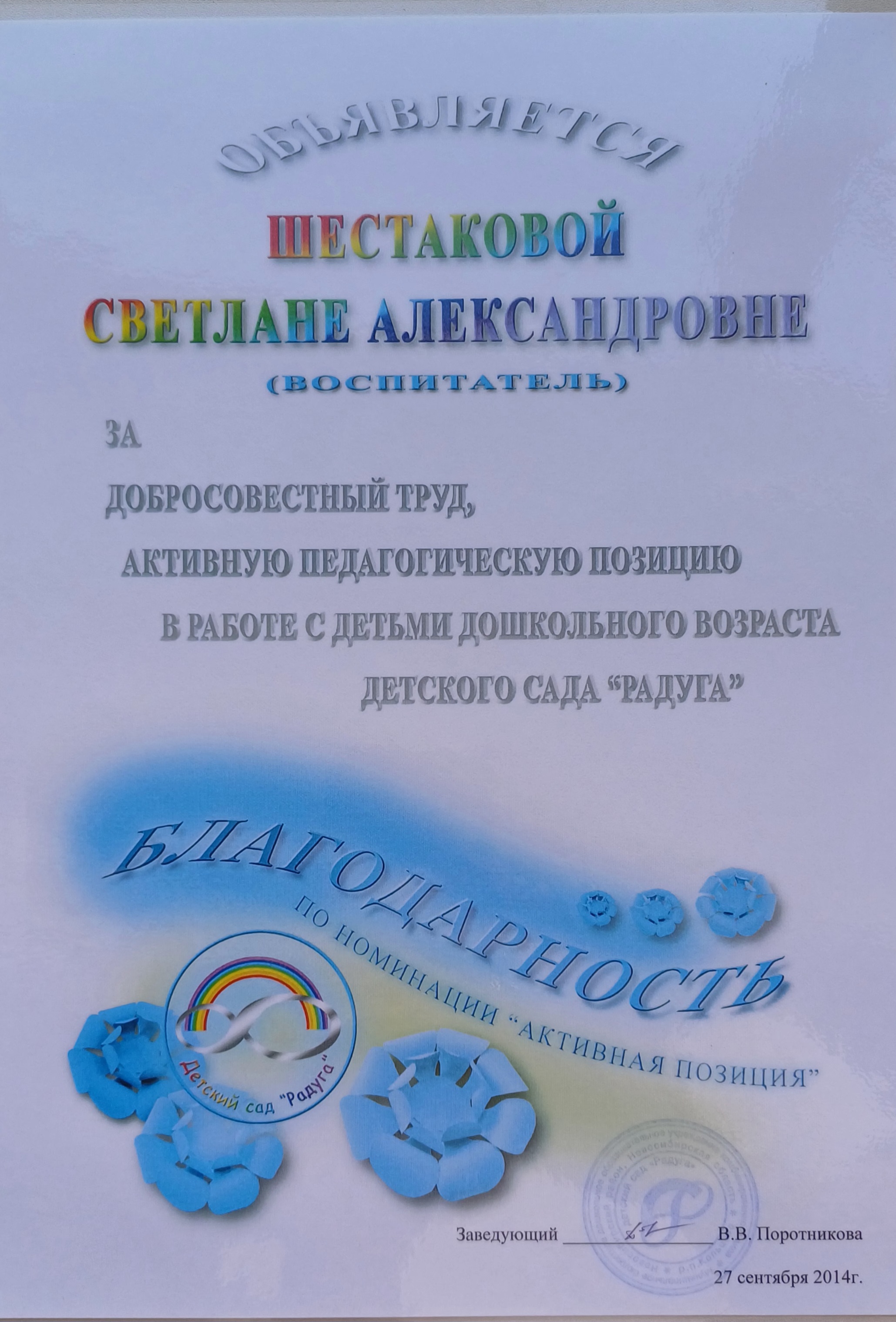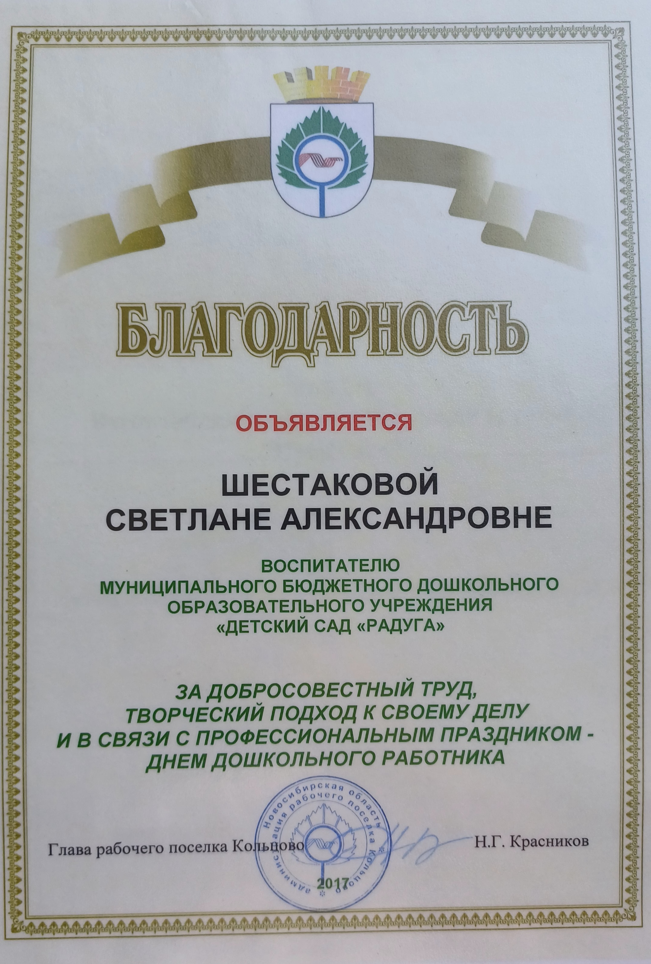 Благодарность за добросовестный труд, творческий подход к своему делу и в связи с профессиональным праздником - Днём Дошкольного работника