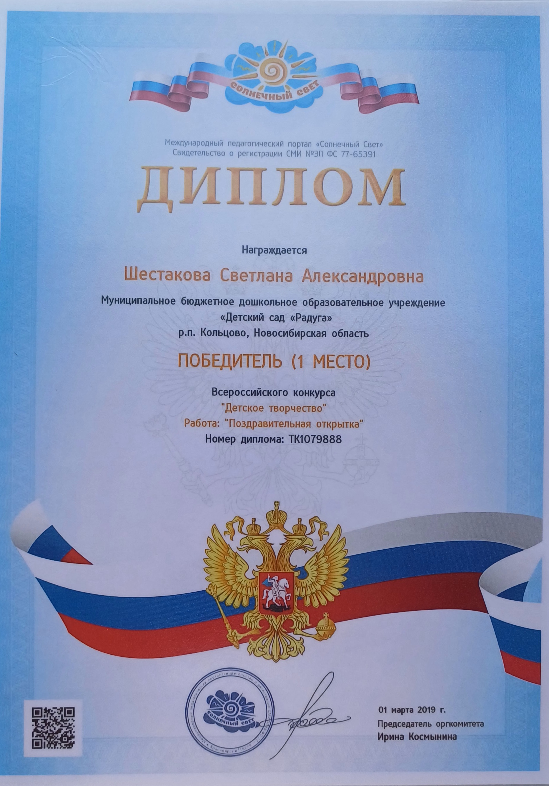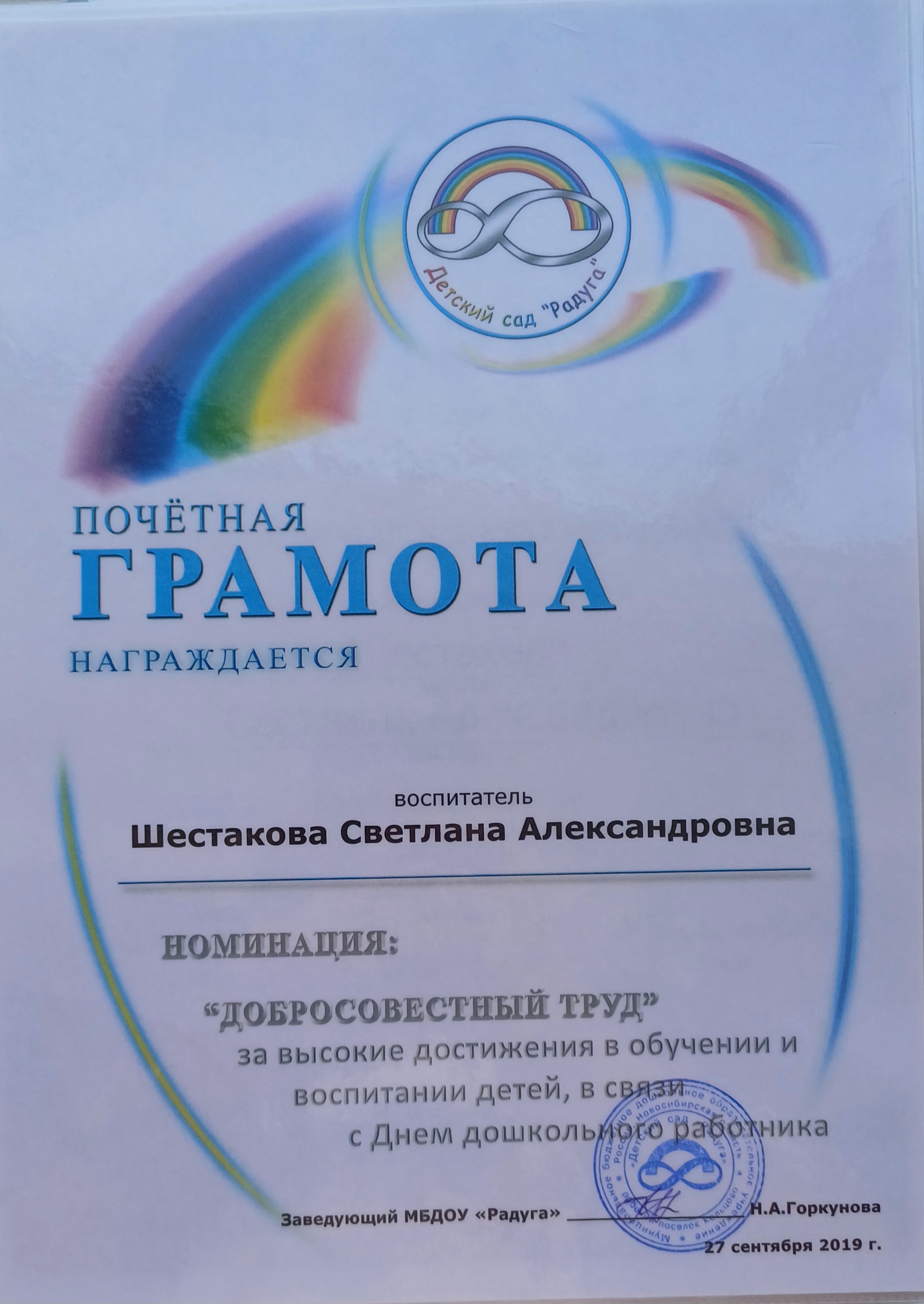Почётная грамота в номинации "Добросовестный труд" за высокие достижения в обучении и воспитании детей, в связи Днём дошкольного работника"