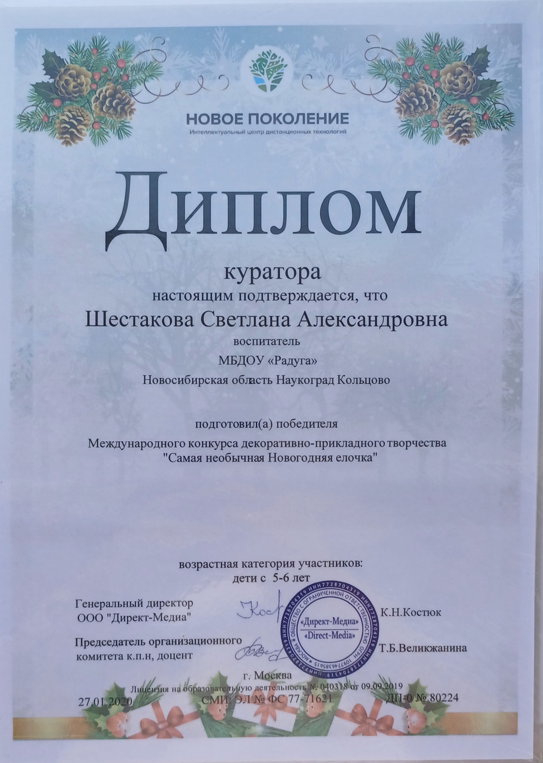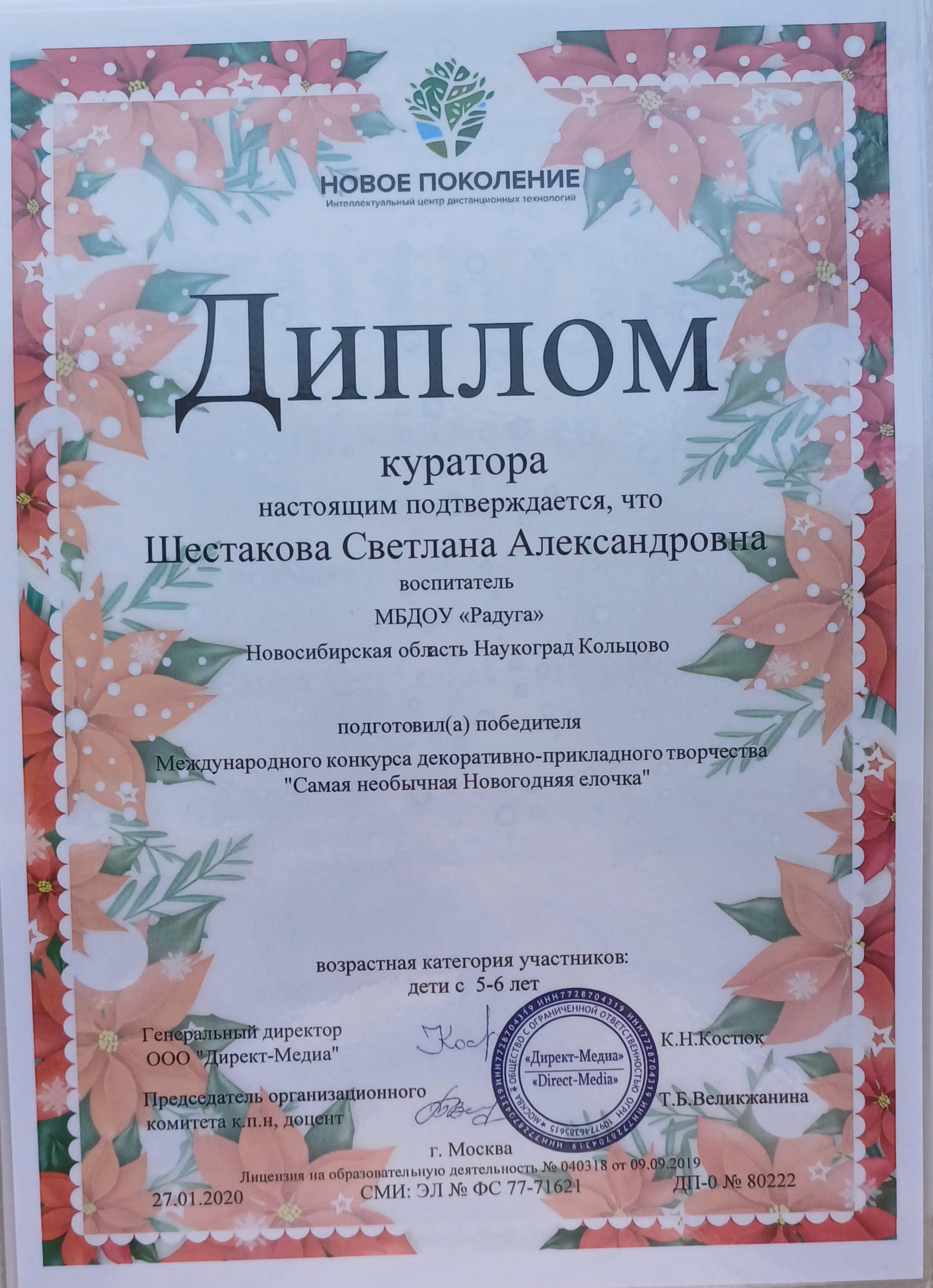 Диплом куратора Международного конкурса декоративно - прикладного творчества "Самая необычная Новогодняя елочка"