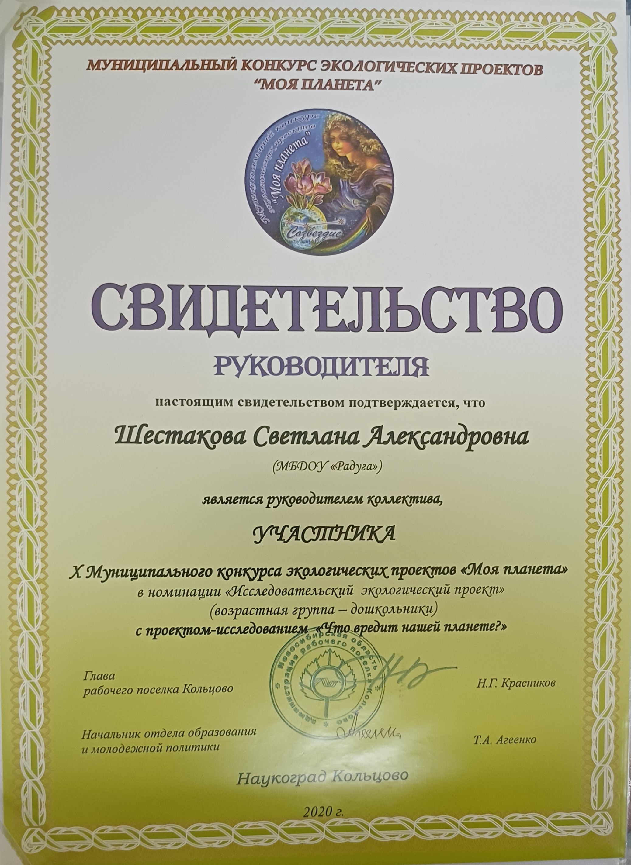 Свидетельство руководителя Х Муниципального конкурса экологических проектов "Моя планета"