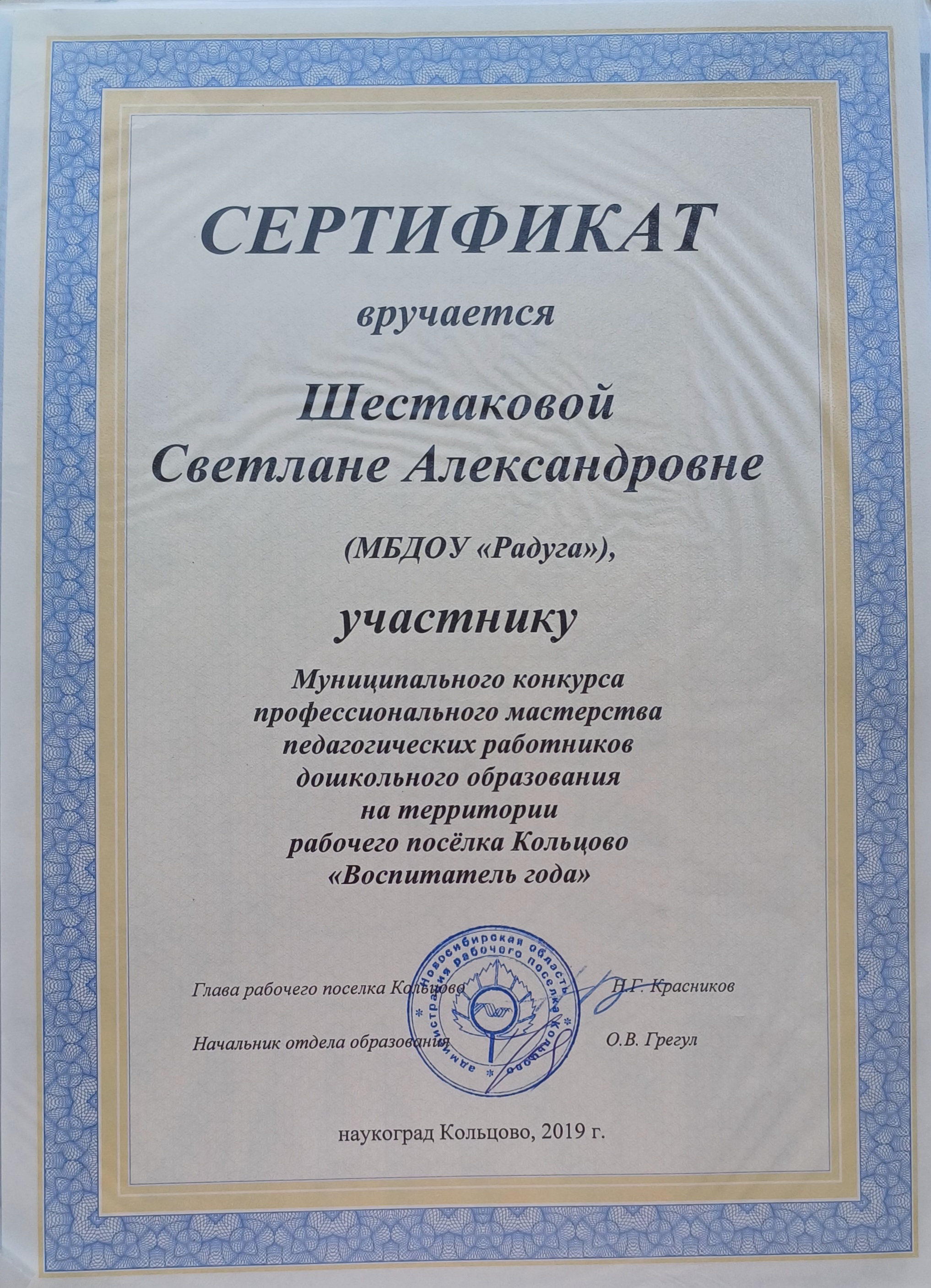 Сертификат участника Муниципального конкурса профессионального мастерства педагогических работников дошкольного образования на территории рабочего посёлка Кольцово "Воспитатель года"