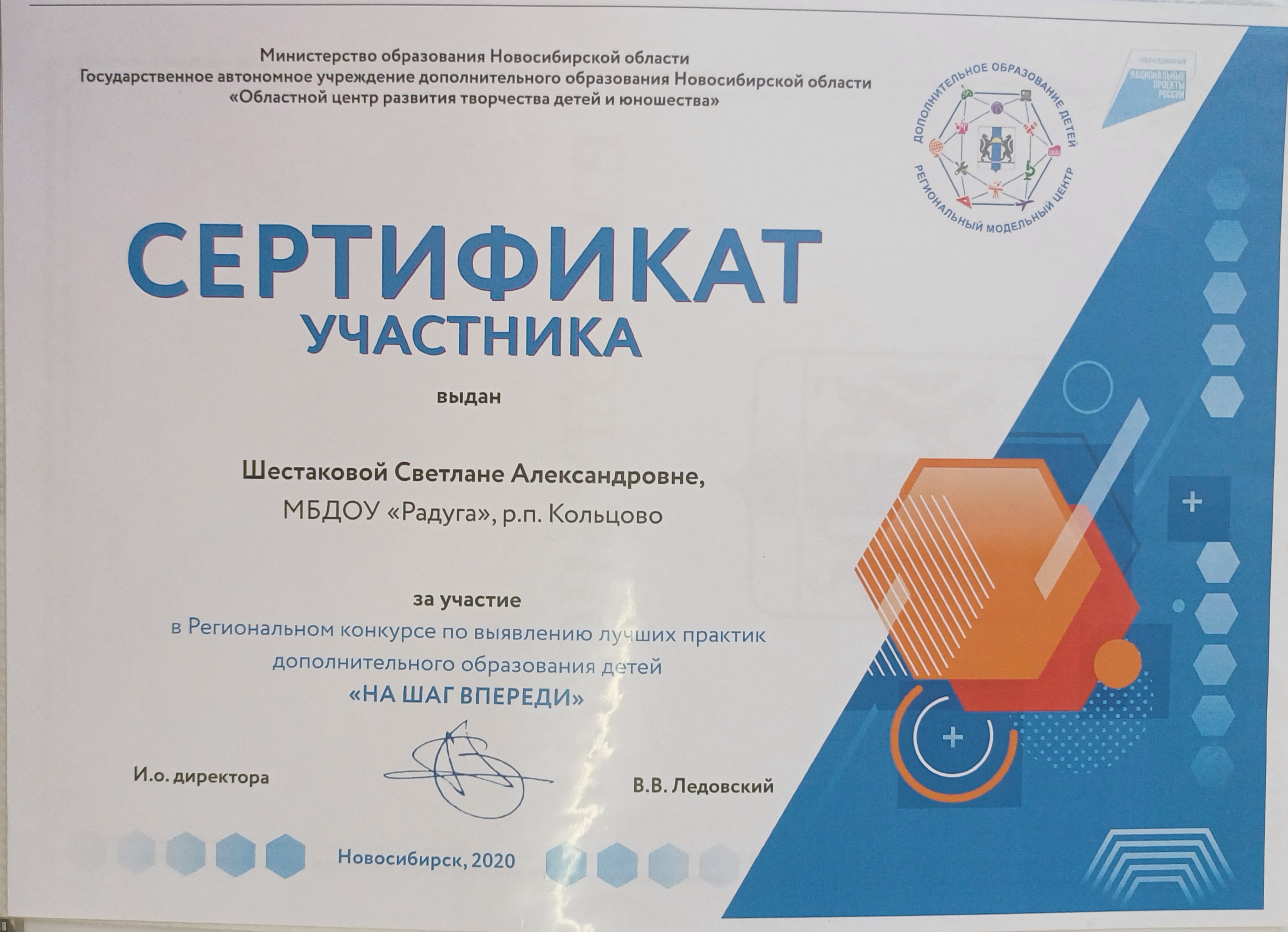 Сертификат участника за участие в Региональном конкурсе по выявлению лучших практик дополнительного образования детей "На шаг впереди"