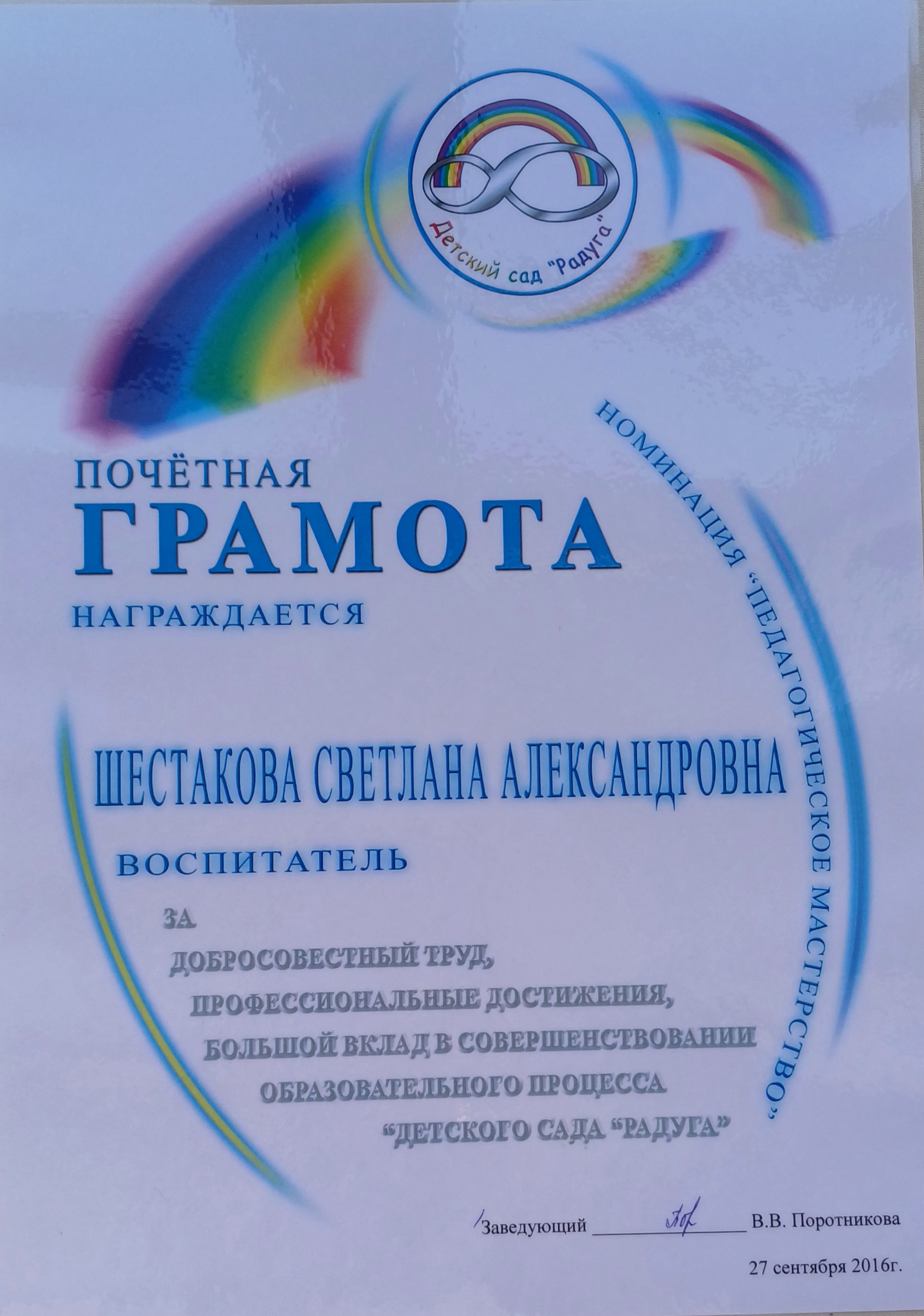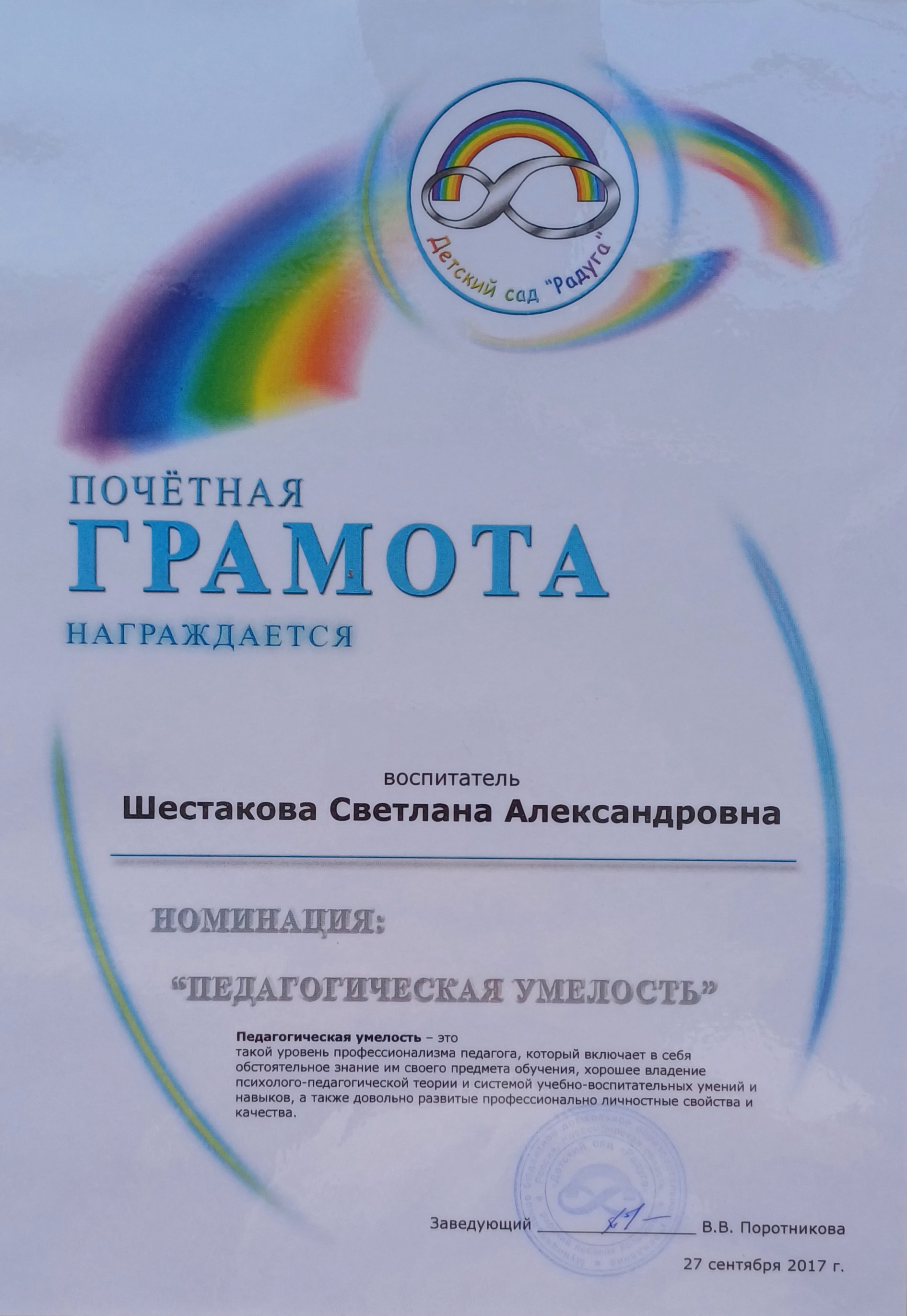 Почеиная грамота в номинации "Педагогическое мастрество"