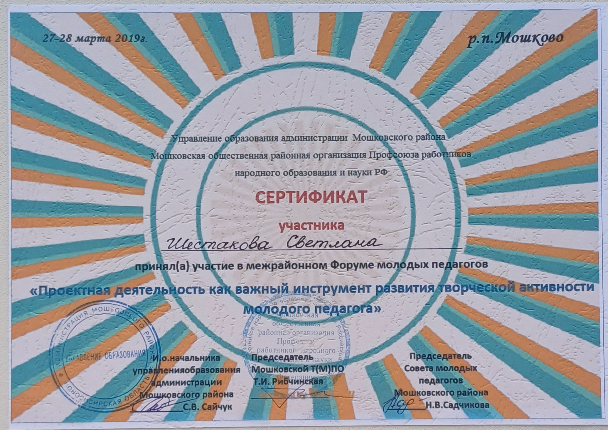 Сертификат участника в международном Форуме молодых педагогов "Проектная деятельность, как важный инструмент развития творческой активности молодого педагога"