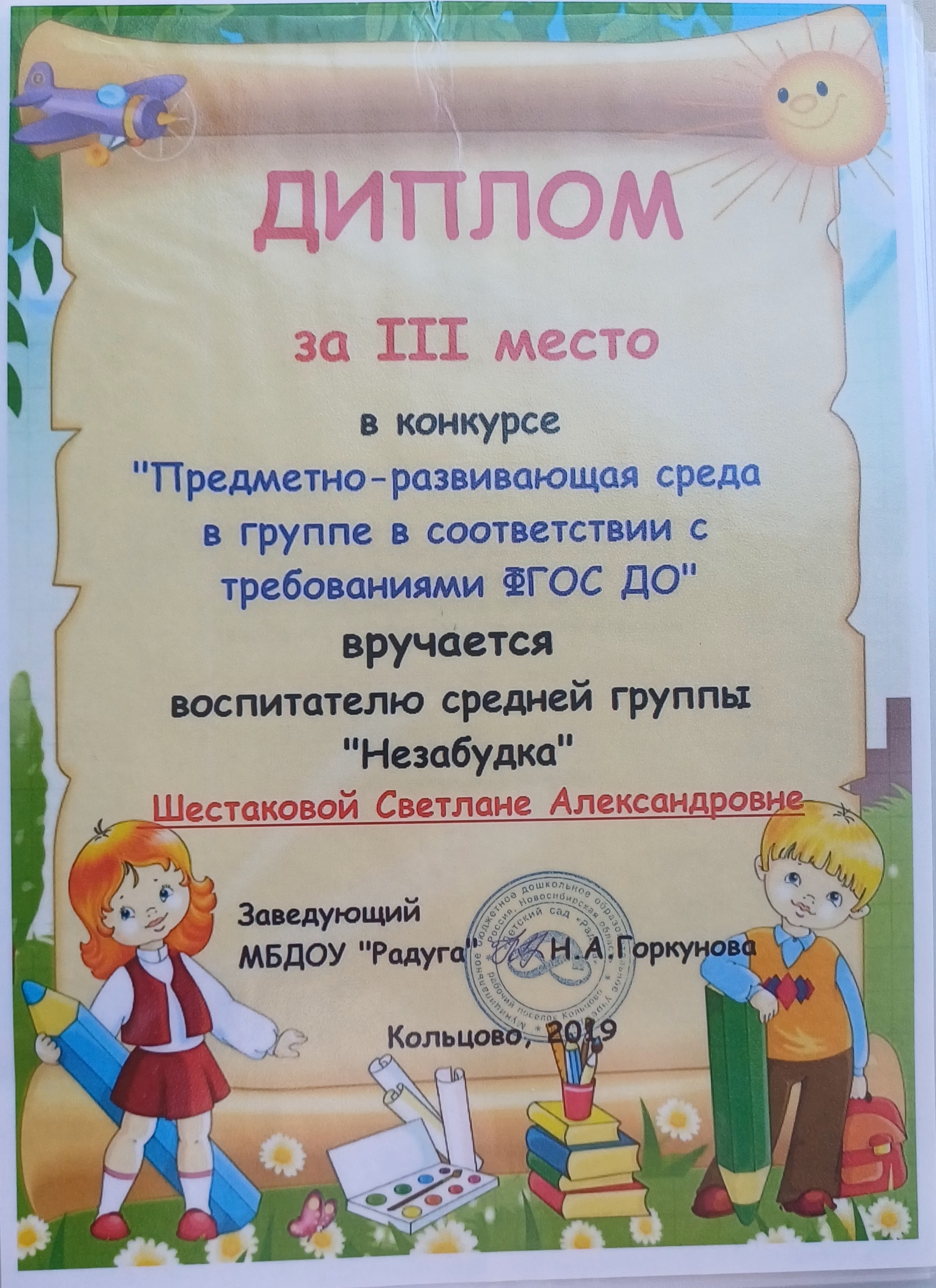 Диплом за III место в конкурсе " Предметно-развивающая среда в группе в соответствии с требованиями ФГОС ДО"