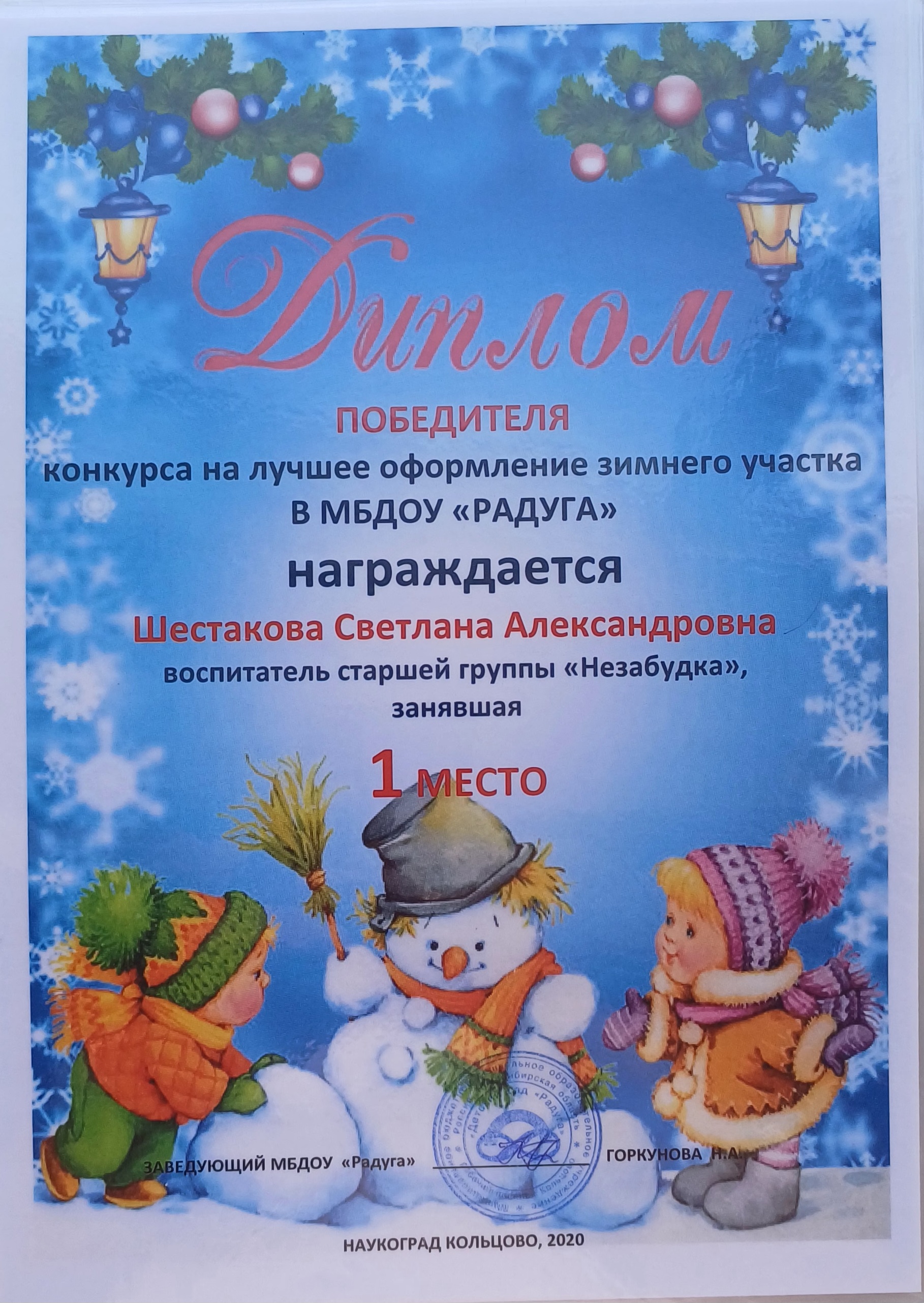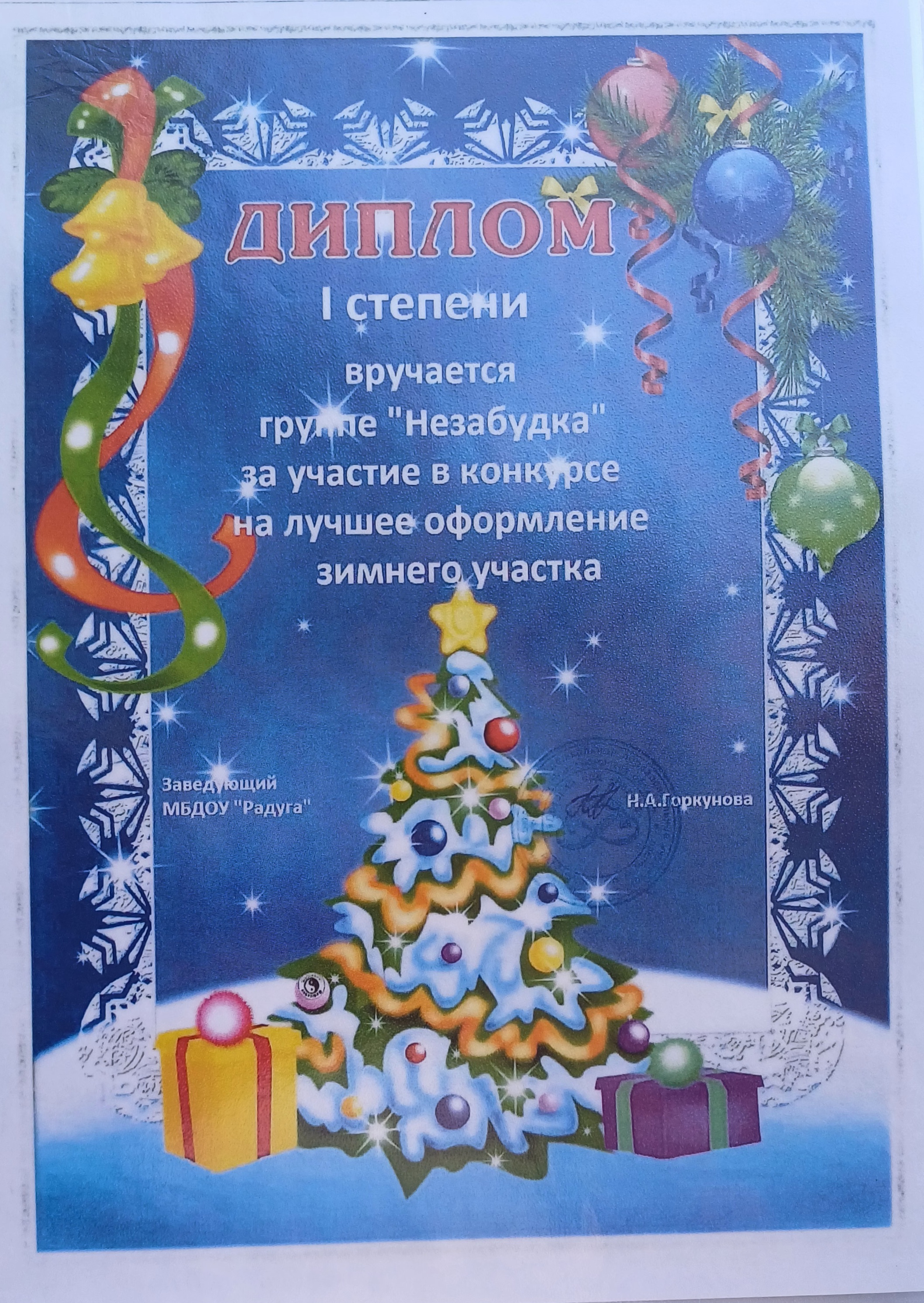 Диплом победителя конкурса на лучшее оформление зимнего участка в МБДОУ "Радуга "
