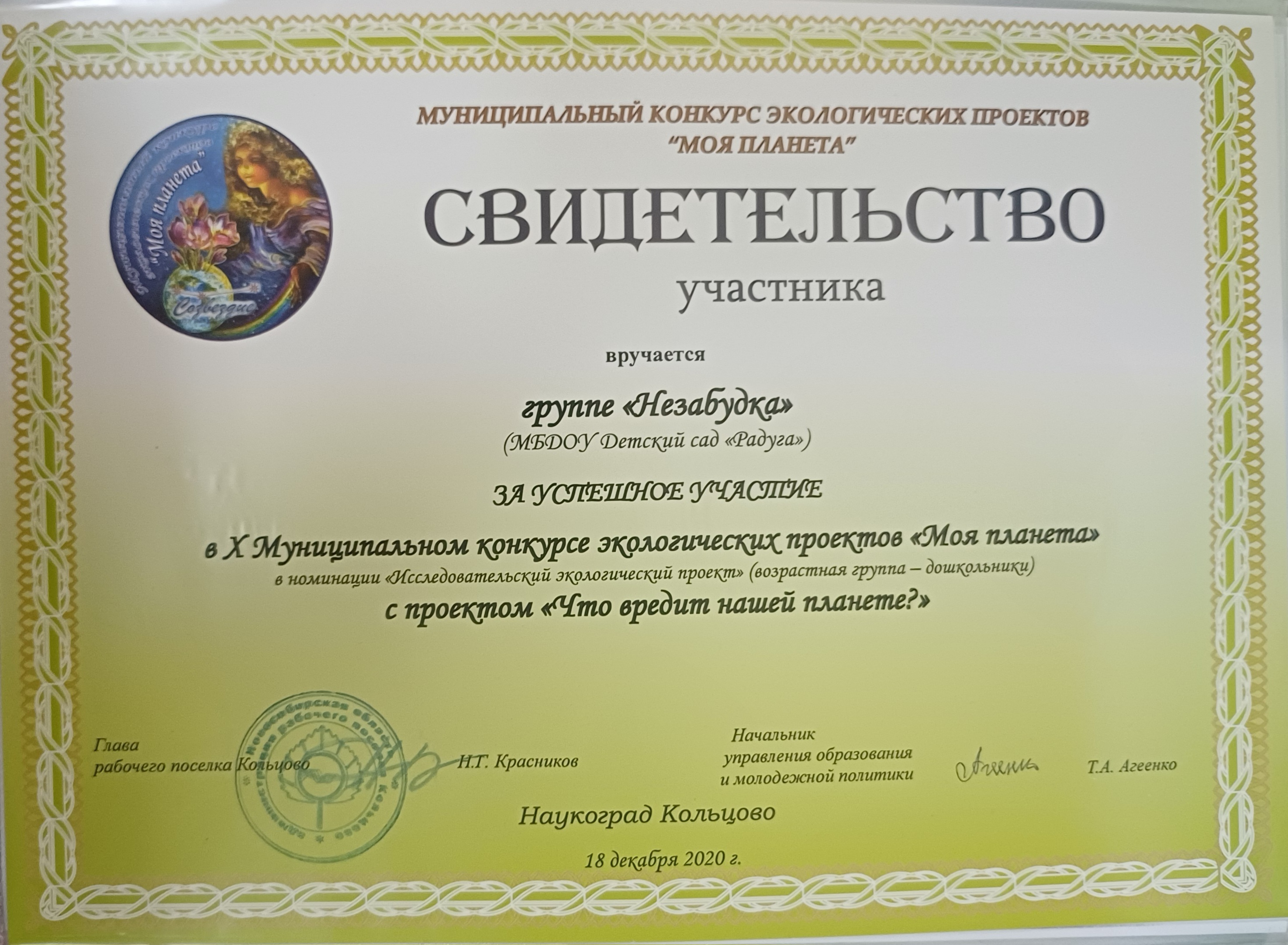 Свидетельство участника за участие в конкурсе в Х Муниципального конкурсе экологических проектов "Моя планета"