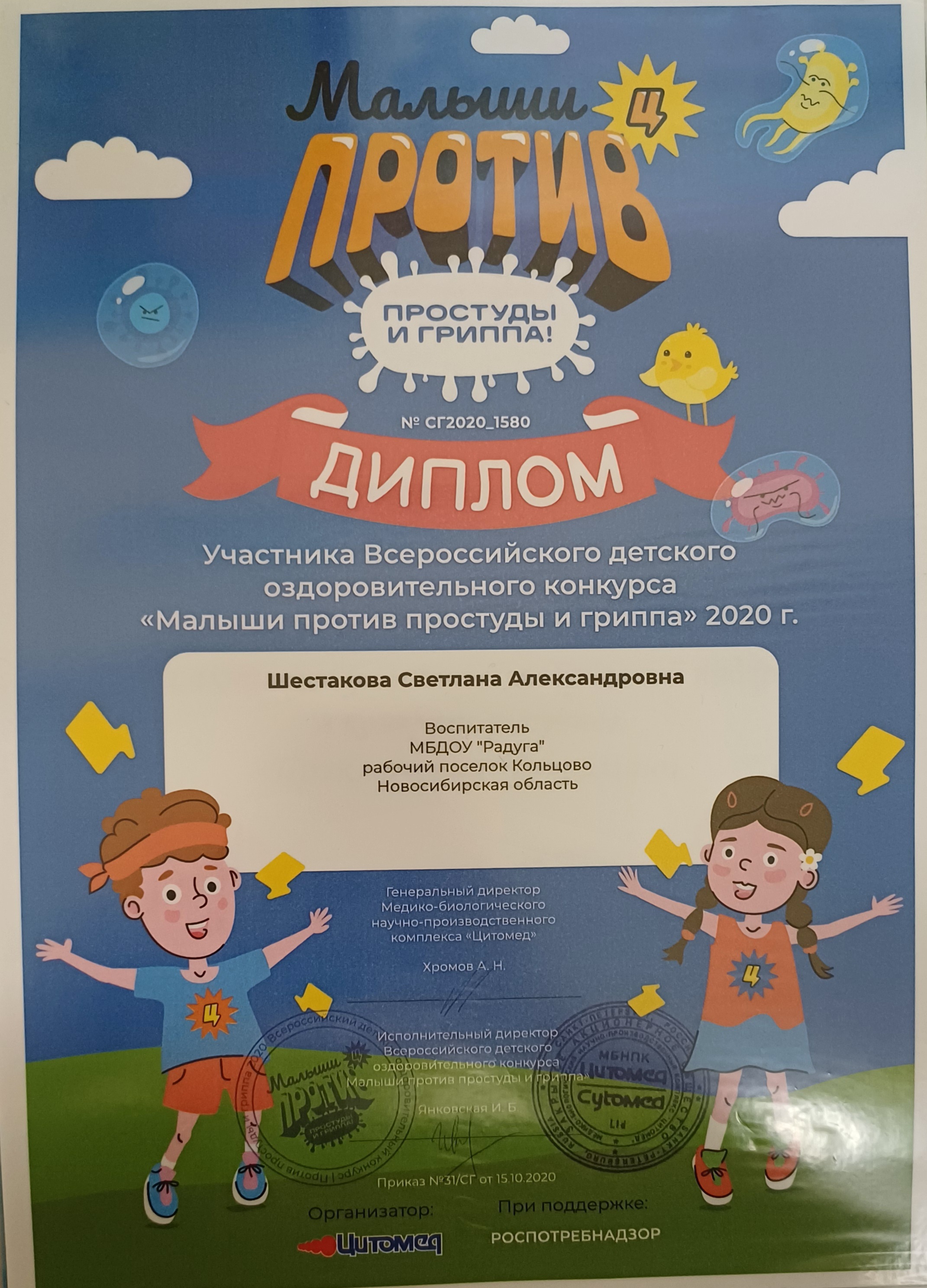 Диплом участника Всероссийского детского оздоровительного конкурса "Малыши против простуды и гриппа" 2020г.