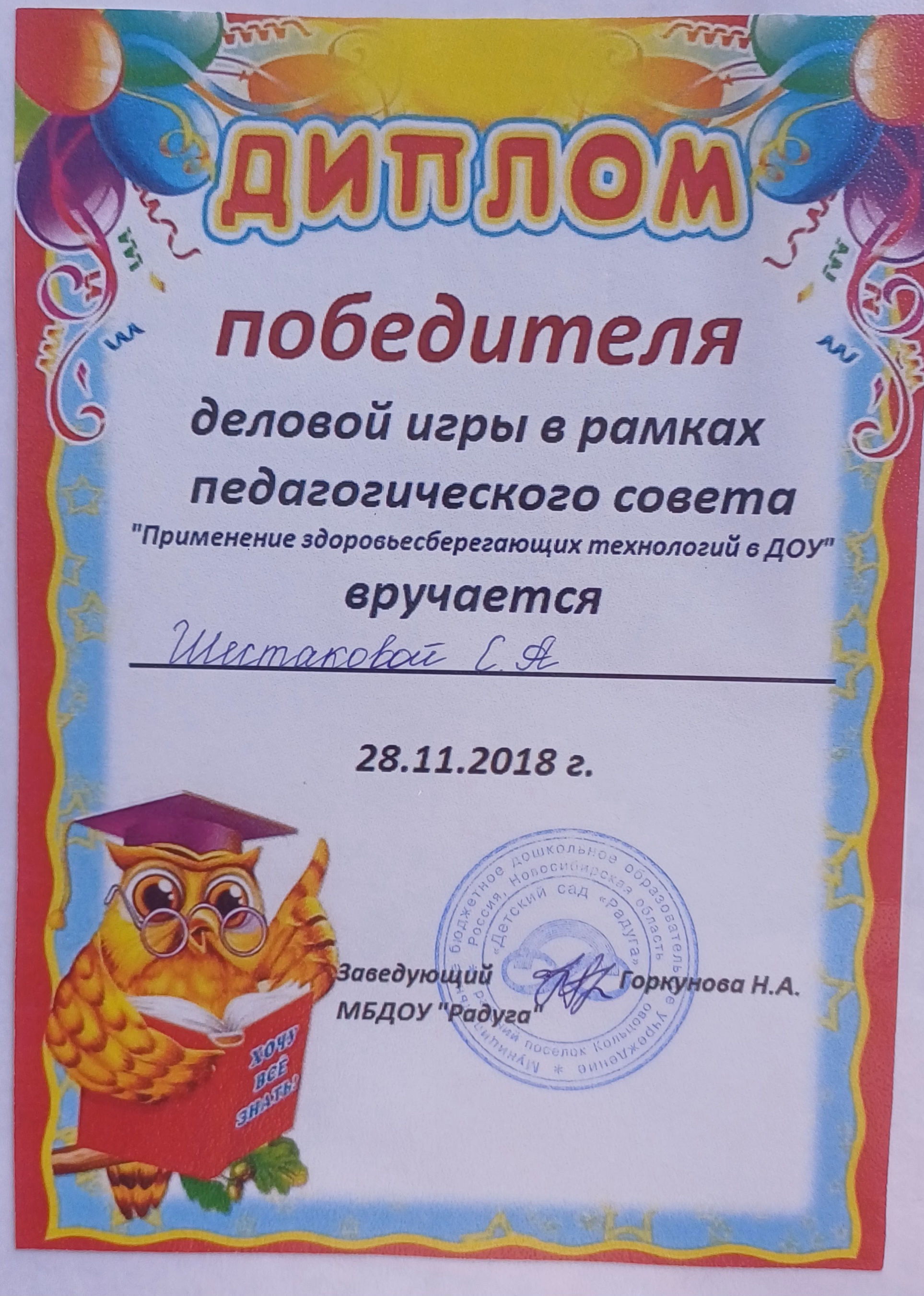 Диплом победителя в деловой игре в рамках педагогического совета "Применение здоровьесберегающих технологий в ДОУ"