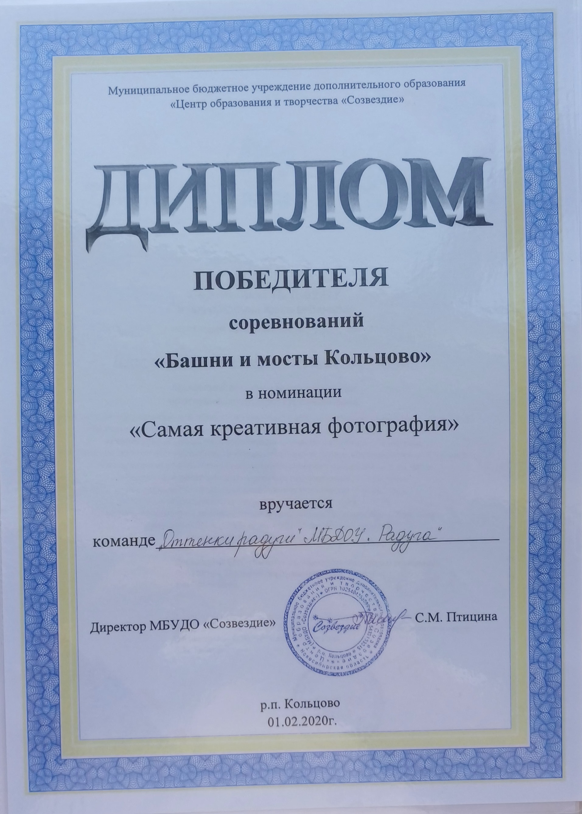 Диплом победителя соревнований "Башни и мосты Кольцово " в номинации "Самая креативная фотография "