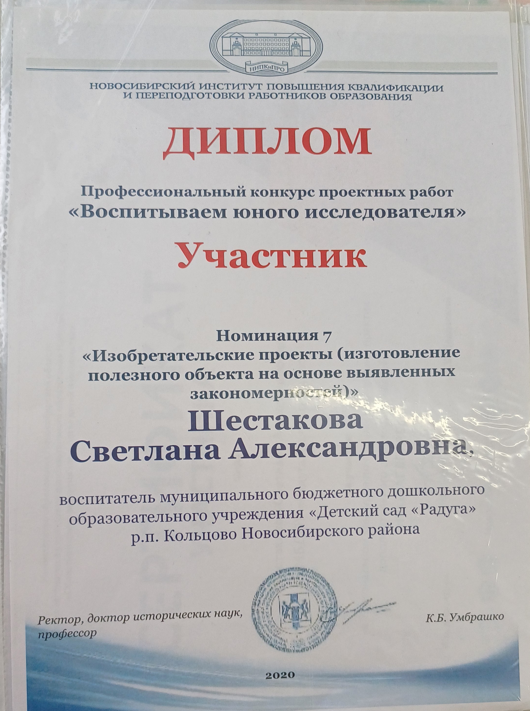 Диплом участника Профессионального конкурса проектных работ "Воспитываем юного исследователя" в номинации "Изобретательские проекты (изготовление полезного объекта на основе выявленных закономерностей)