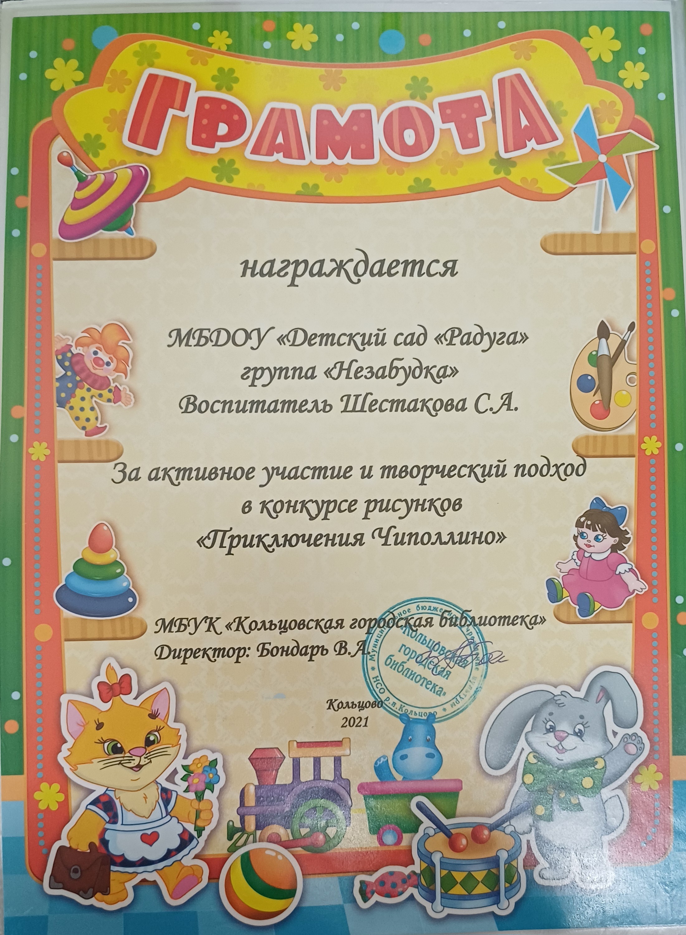 Грамота за активное участие и творческий подход в конкурсе рисунков "Приключения Чиполлино"