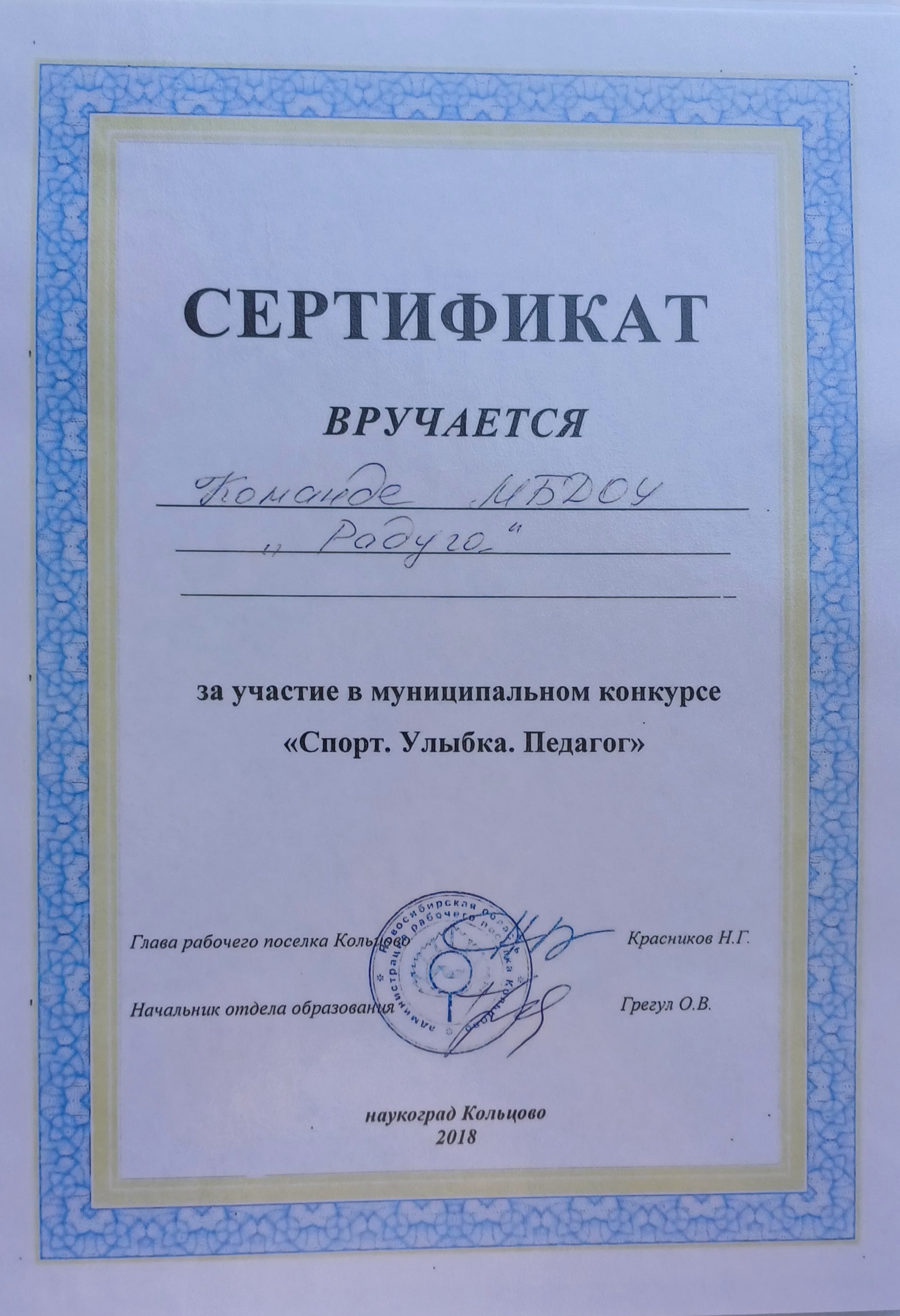 Сертификат за участие в муниципальном конкурсе "Спорт.Улыбка. Педагог"